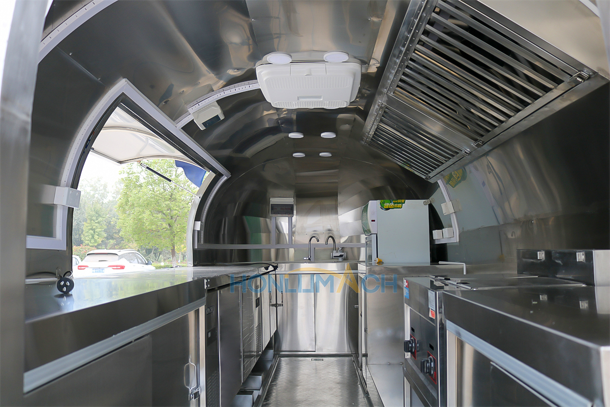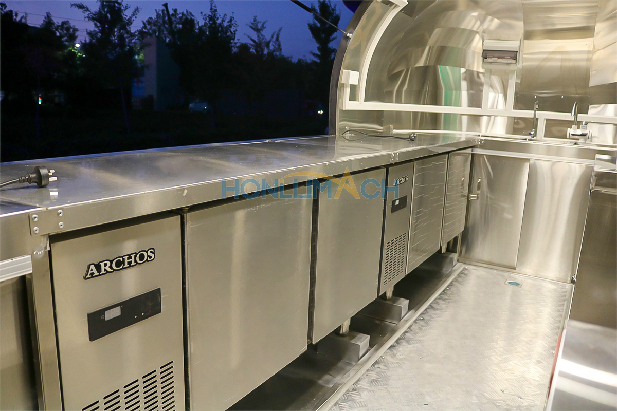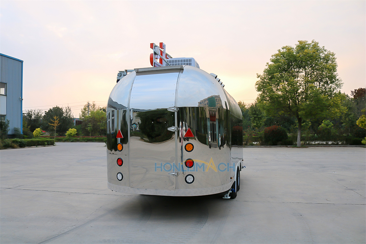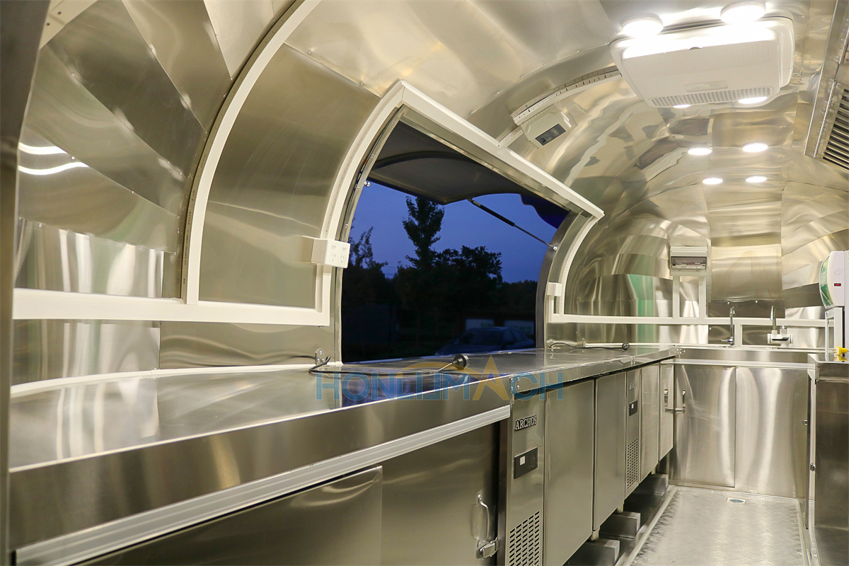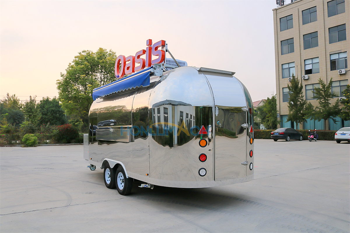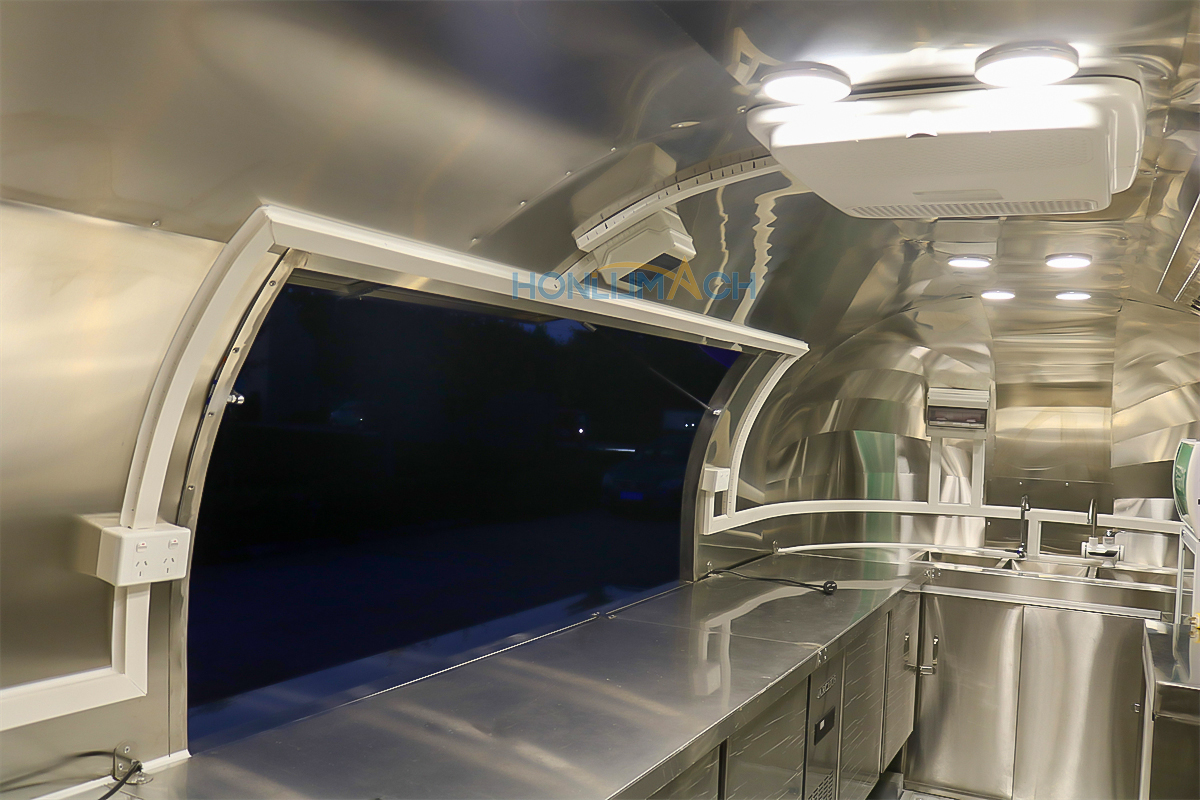 This is a stainless steel food cart, approximately 16.4 feet long, for sale and destined for Canada. The entire cart’s appearance, color, pattern, and structure are custom-made in stainless steel to meet the customer’s requirements. A prominent light sign on the roof is also custom-designed to match the customer’s sales schedule, ensuring visibility even at night. It also features two custom windows with sunshades.