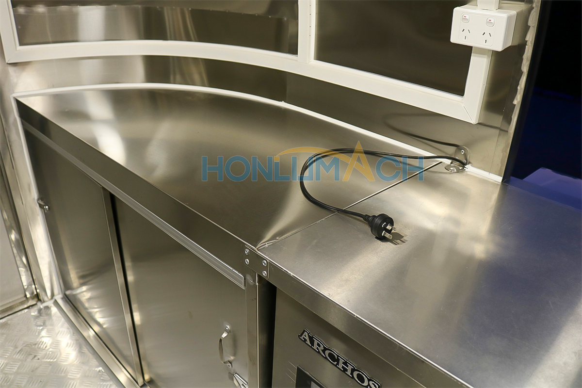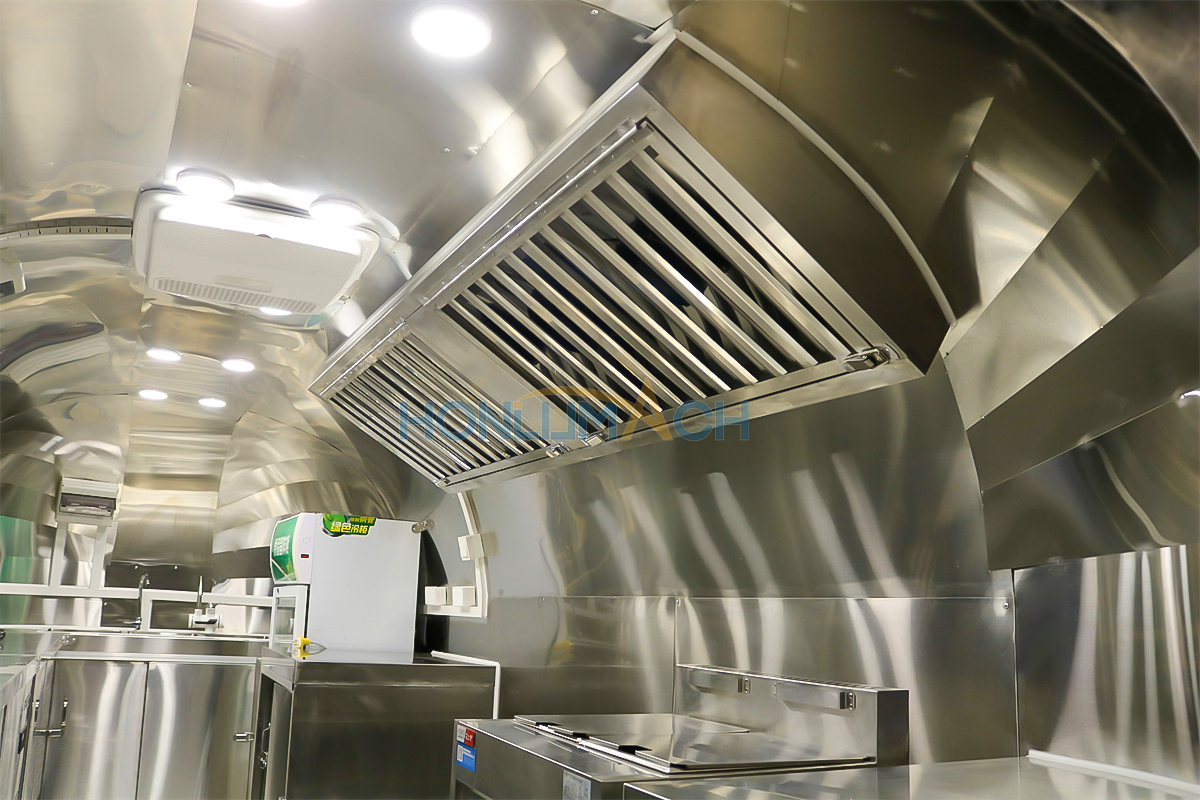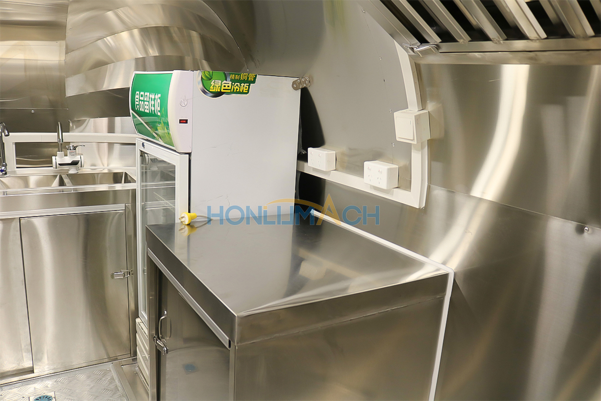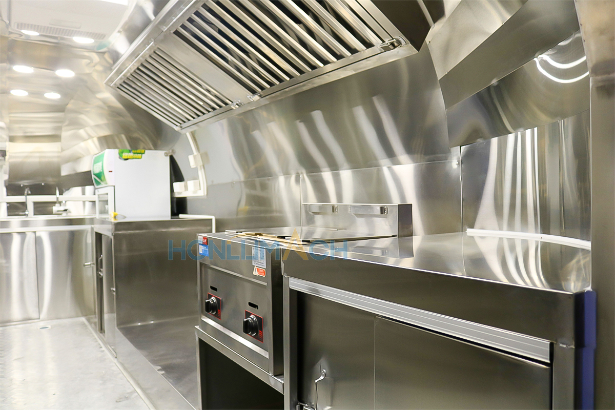 I henhold til kundens krav har vi udstyret den 5 meter store cateringtrailer med køkkenudstyr. Nedenfor er nogle af trailerens indvendige detaljer. Der er en emhætte, vaske, aircondition, et køleskab til salatbaren, et gaskomfur, en gasfrituregryde, en stegeplade, en grill, et opbevaringsskab og en arbejdsbænk osv. Vores kunde vil tilføje andet udstyr, de har brug for, efter at have modtaget traileren.