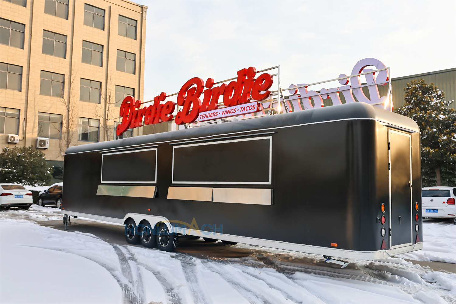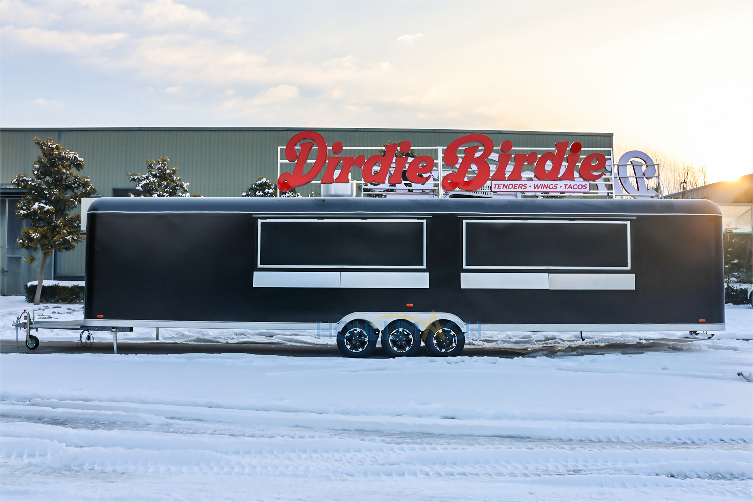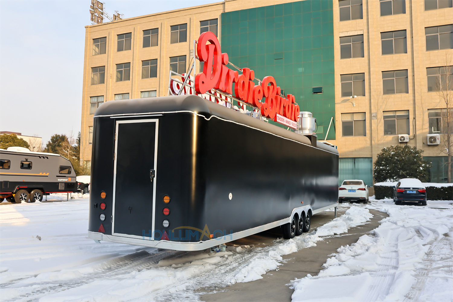 This is a food truck from Canada, approximately 36 feet long. The entire truck’s appearance, color, pattern, and structure were customized to the client’s specifications. A large illuminated sign was also custom-made to ensure visibility, even in smoggy weather or at night. It also features two custom-made windows with sunshades.