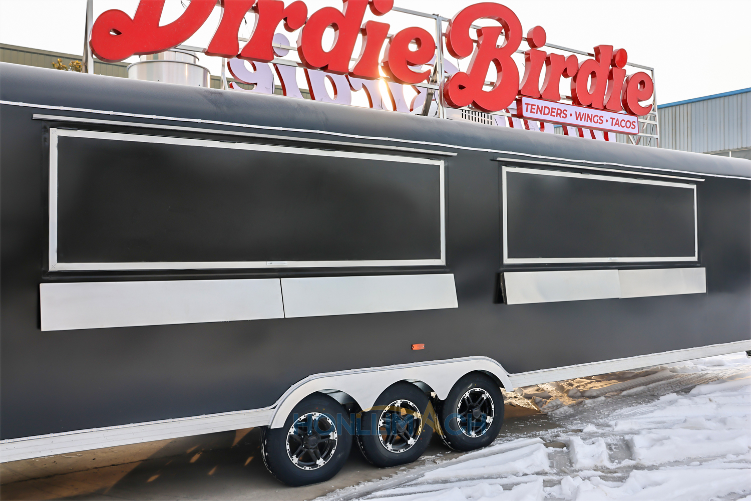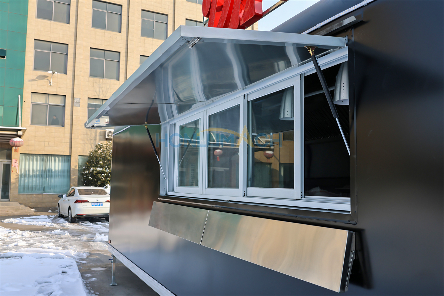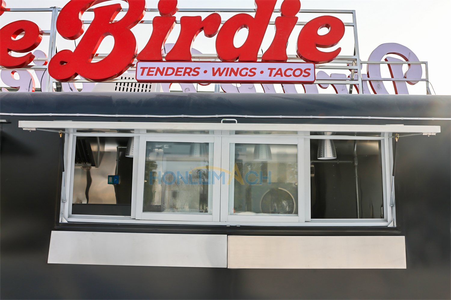 Στο μπροστινό μέρος του ρυμουλκούμενου τροφίμων, έχουμε φτιάξει δύο μεγάλα παράθυρα εξυπηρέτησης σύμφωνα με τις απαιτήσεις του πελάτη. Αυτό θα είναι πολύ βολικό για τους επισκέπτες που έρχονται να δειπνήσουν για να παραγγείλουν και να παραλάβουν τα γεύματά τους. Στην κορυφή κάθε παραθύρου, έχουμε εγκαταστήσει μια αναδιπλούμενη τέντα. Η τέντα θα προστατεύει τους ανθρώπους από την ηλιοφάνεια και τη βροχή, η οποία είναι ένας προσεκτικός σχεδιασμός. Στη συνέχεια, ας δούμε την πίσω όψη αυτού του μεγάλου ρυμουλκούμενου φαγητού.