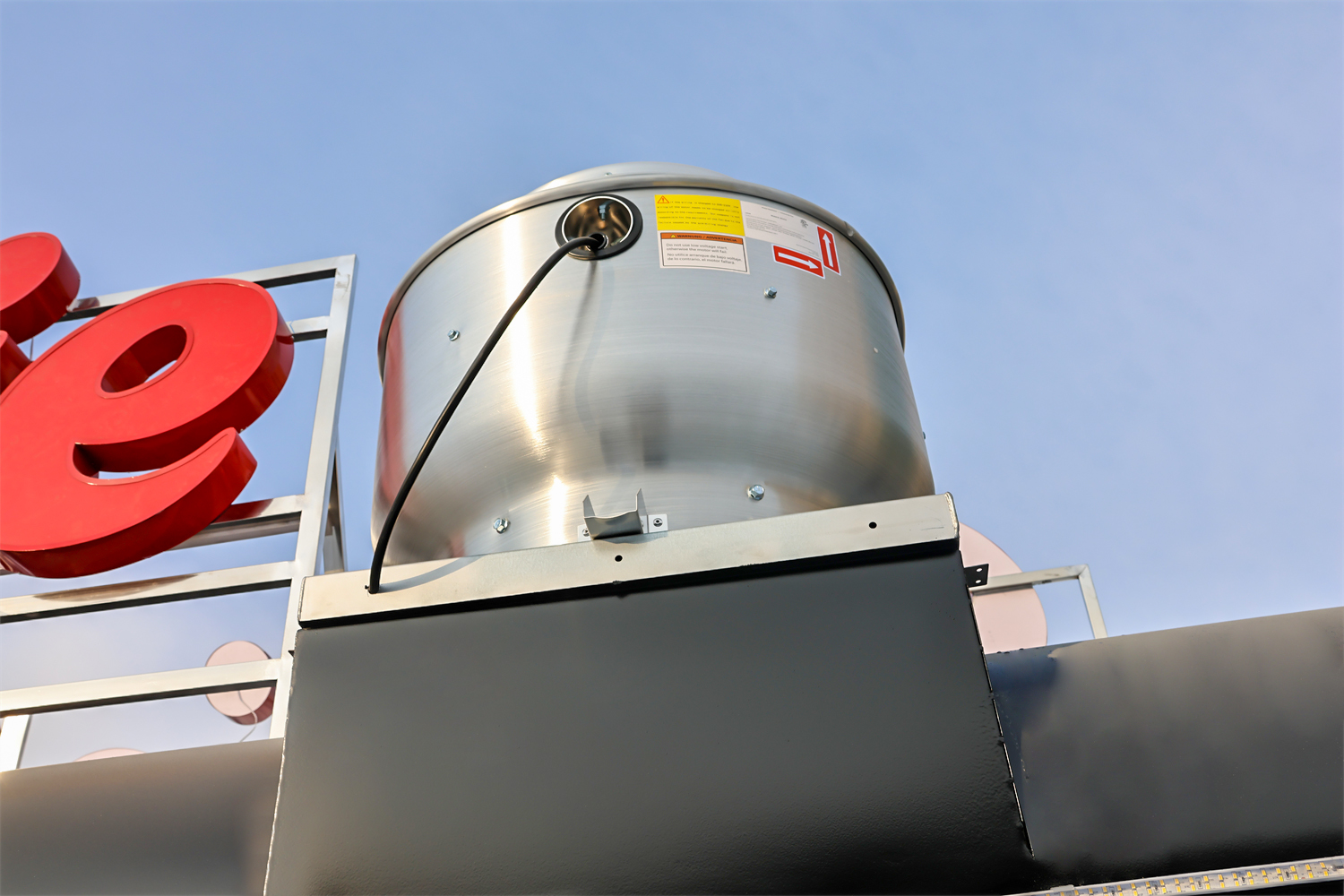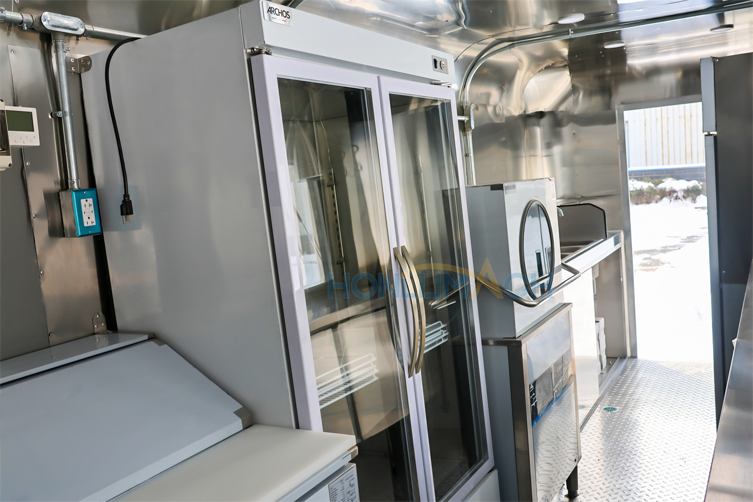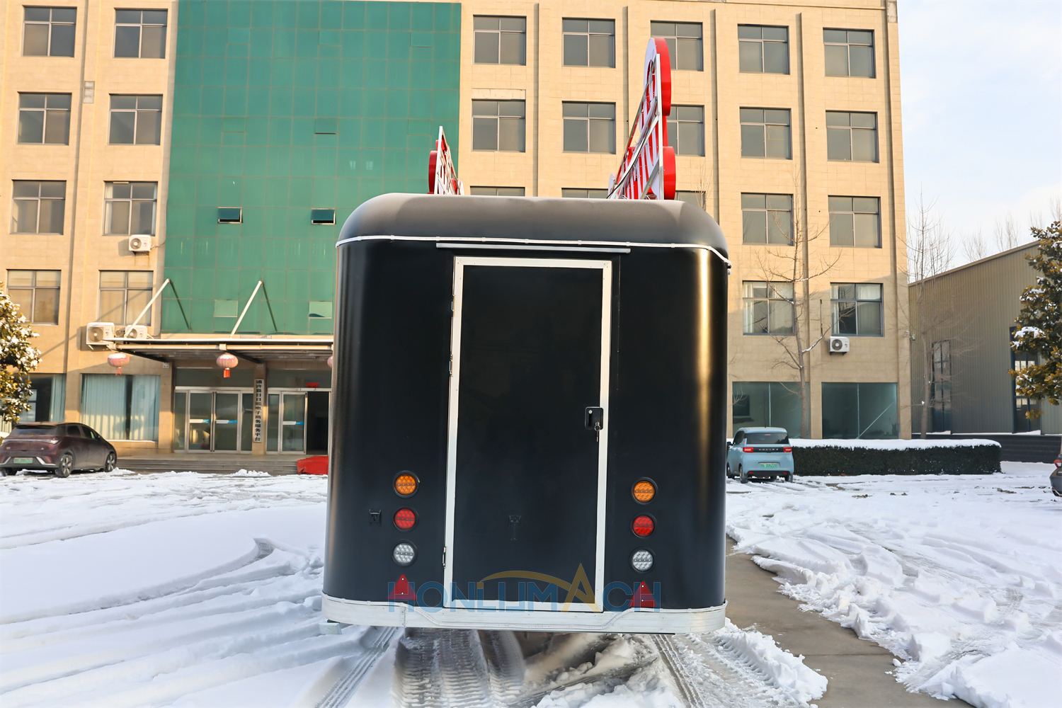Στο μπροστινό μέρος του ρυμουλκούμενου τροφίμων, έχουμε φτιάξει δύο μεγάλα παράθυρα εξυπηρέτησης σύμφωνα με τις απαιτήσεις του πελάτη. Αυτό θα είναι πολύ βολικό για τους επισκέπτες που έρχονται να δειπνήσουν για να παραγγείλουν και να παραλάβουν τα γεύματά τους. Στην κορυφή κάθε παραθύρου, έχουμε εγκαταστήσει μια αναδιπλούμενη τέντα. Η τέντα θα προστατεύει τους ανθρώπους από την ηλιοφάνεια και τη βροχή, η οποία είναι ένας προσεκτικός σχεδιασμός. Στη συνέχεια, ας δούμε την πίσω όψη αυτού του μεγάλου ρυμουλκούμενου φαγητού.