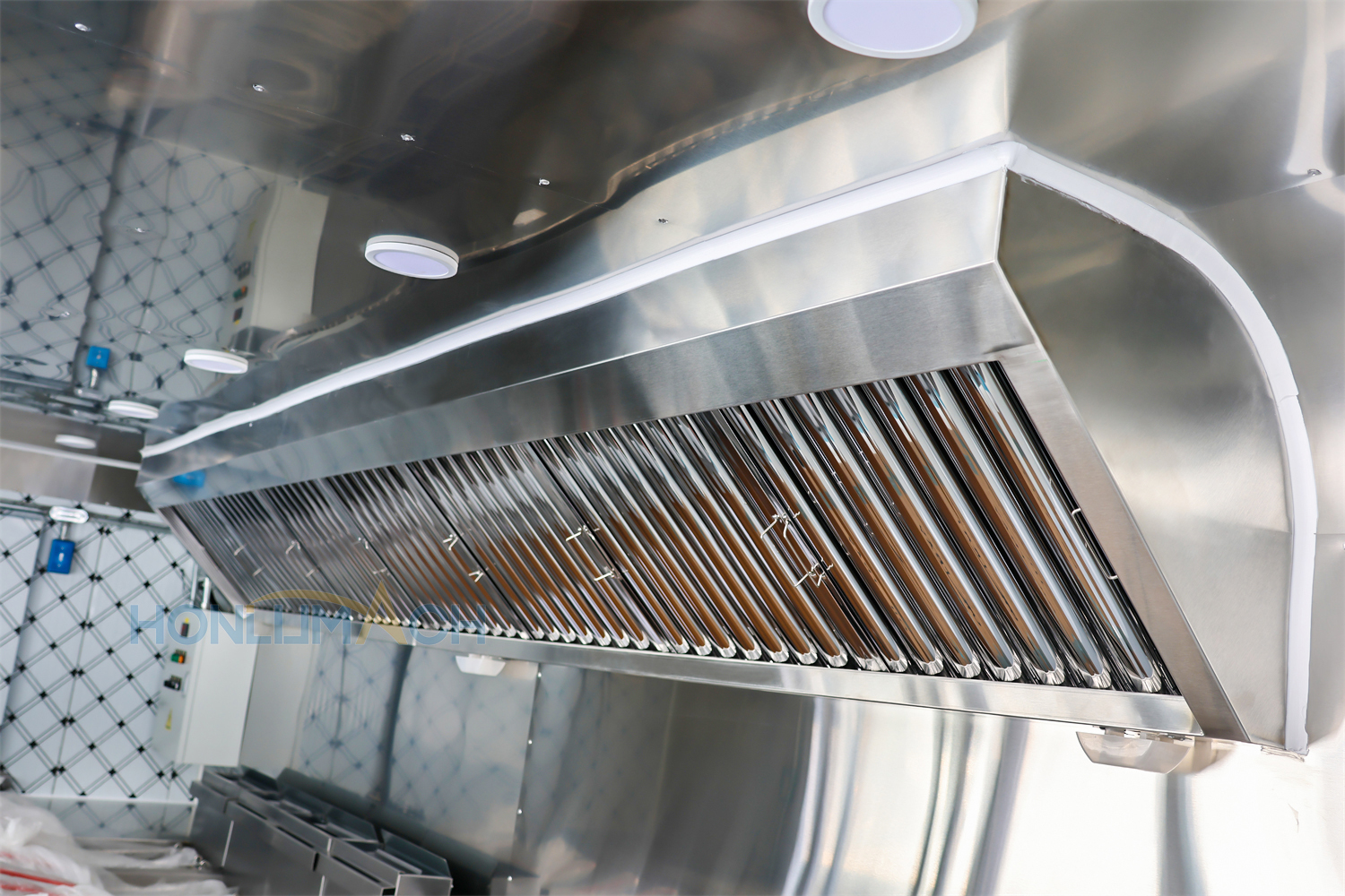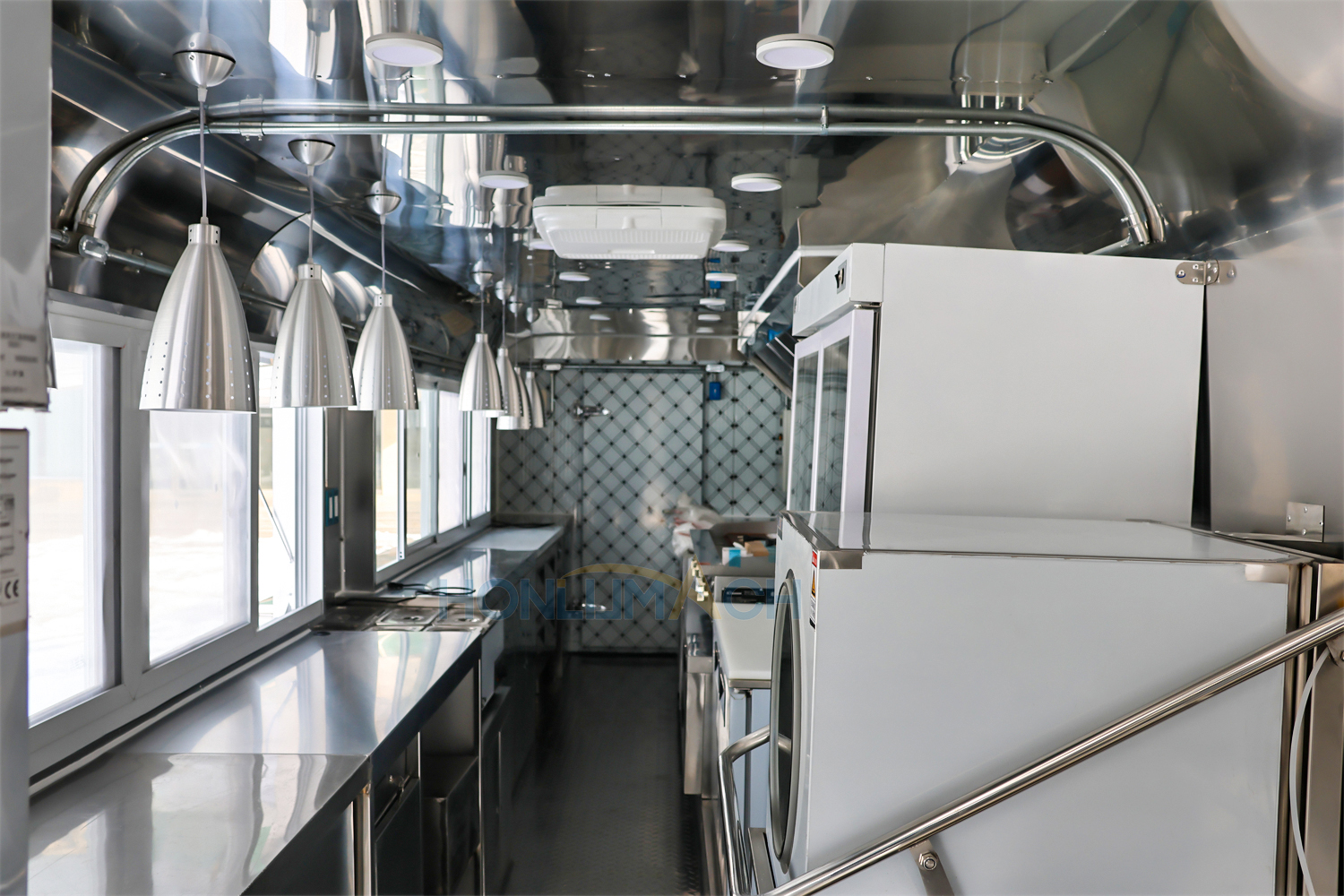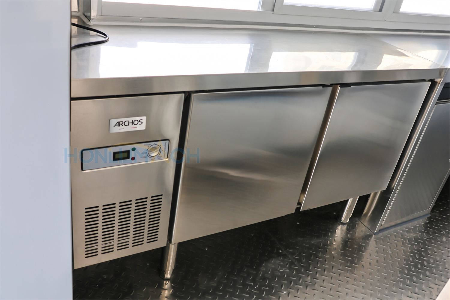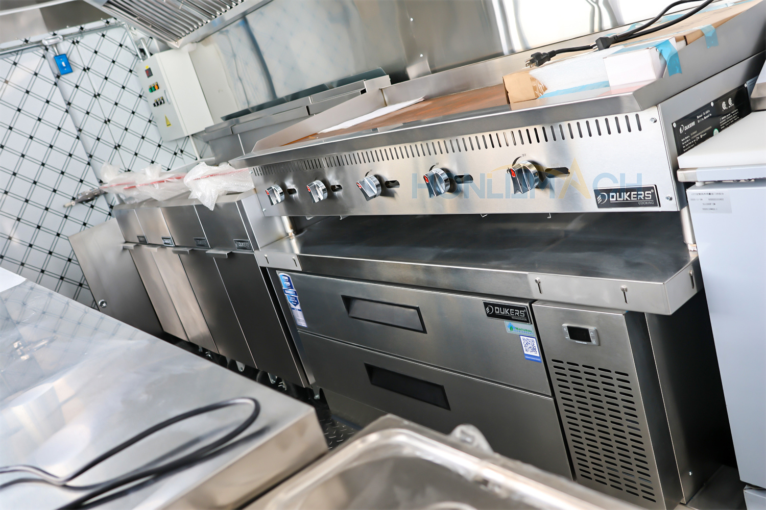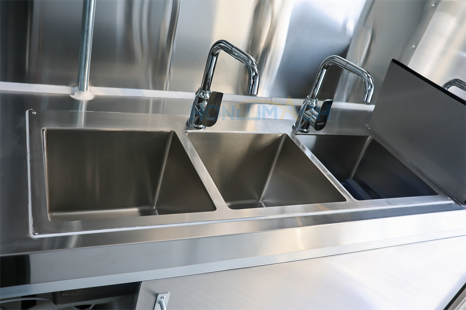 According to the customer’s requirements, we have equipped the 11m large catering trailer with kitchen equipment. In the following are some of the inner details of this trailer. There is a range hood, sinks, an air conditioner, a salad bar refrigerator, a gas stove, a gas fryer, a griddle, a grill, a storage cabinet, and a workbench, etc. Our customer will add some other equipment he needs after receiving the trailer.