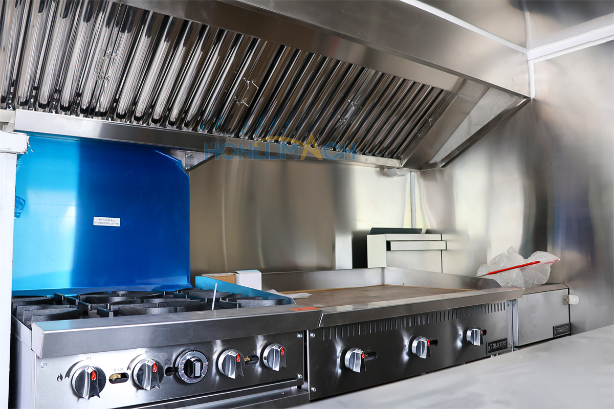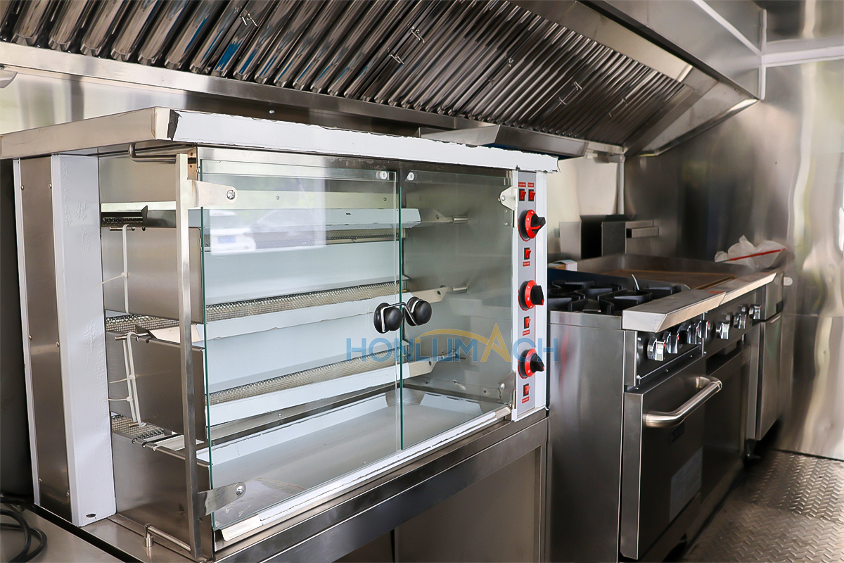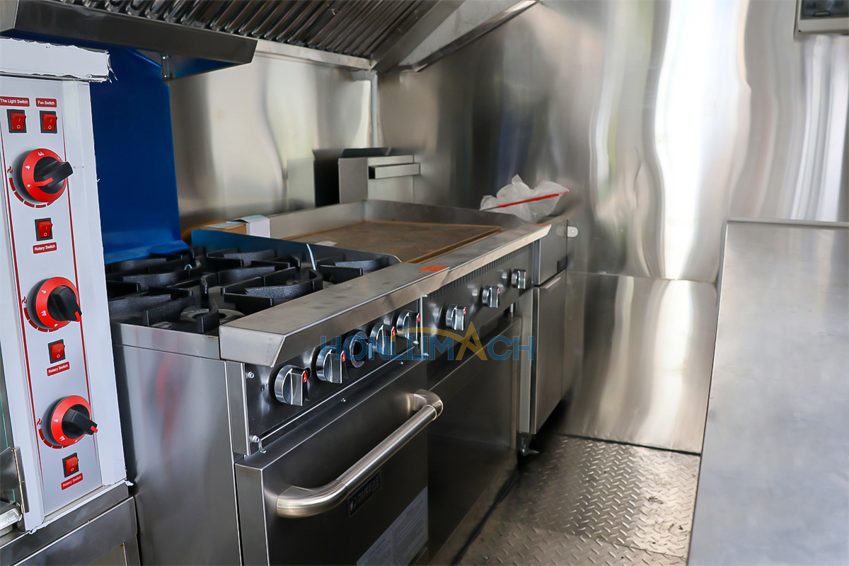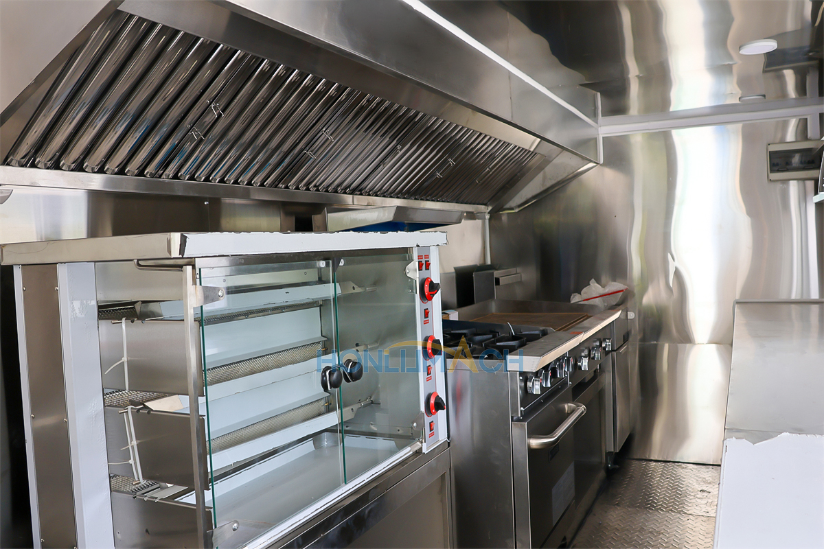 De acuerdo con los requisitos del cliente, hemos equipado el camión de comida de 5,7 m con equipos de cocina. A continuación se muestran algunos de los detalles interiores de este remolque. Hay una campana extractora, un aire acondicionado, una plancha de gas, una cocina de gas, una freidora de gas, fregaderos, frigoríficos, una máquina de shawarma, una amasadora, una máquina de panqueques, etc.