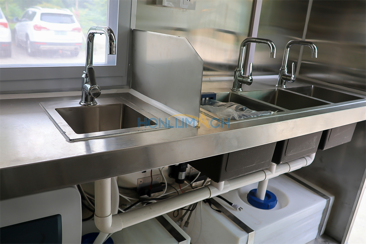 | Configuración estándar | 1) Pared interior de acero inoxidable 201, 2) Banco de trabajo de acero inoxidable 201, 3) Fregaderos de acero inoxidable 304 *2 4) grifo de agua caliente y fría *1 5) Cesta de agua de 20 litros *2 6) neumático*4 7) gato*4 8) gran ventana de servicio * 1 9) enchufe*6 10) interruptor de encendido Más, personalizado |
