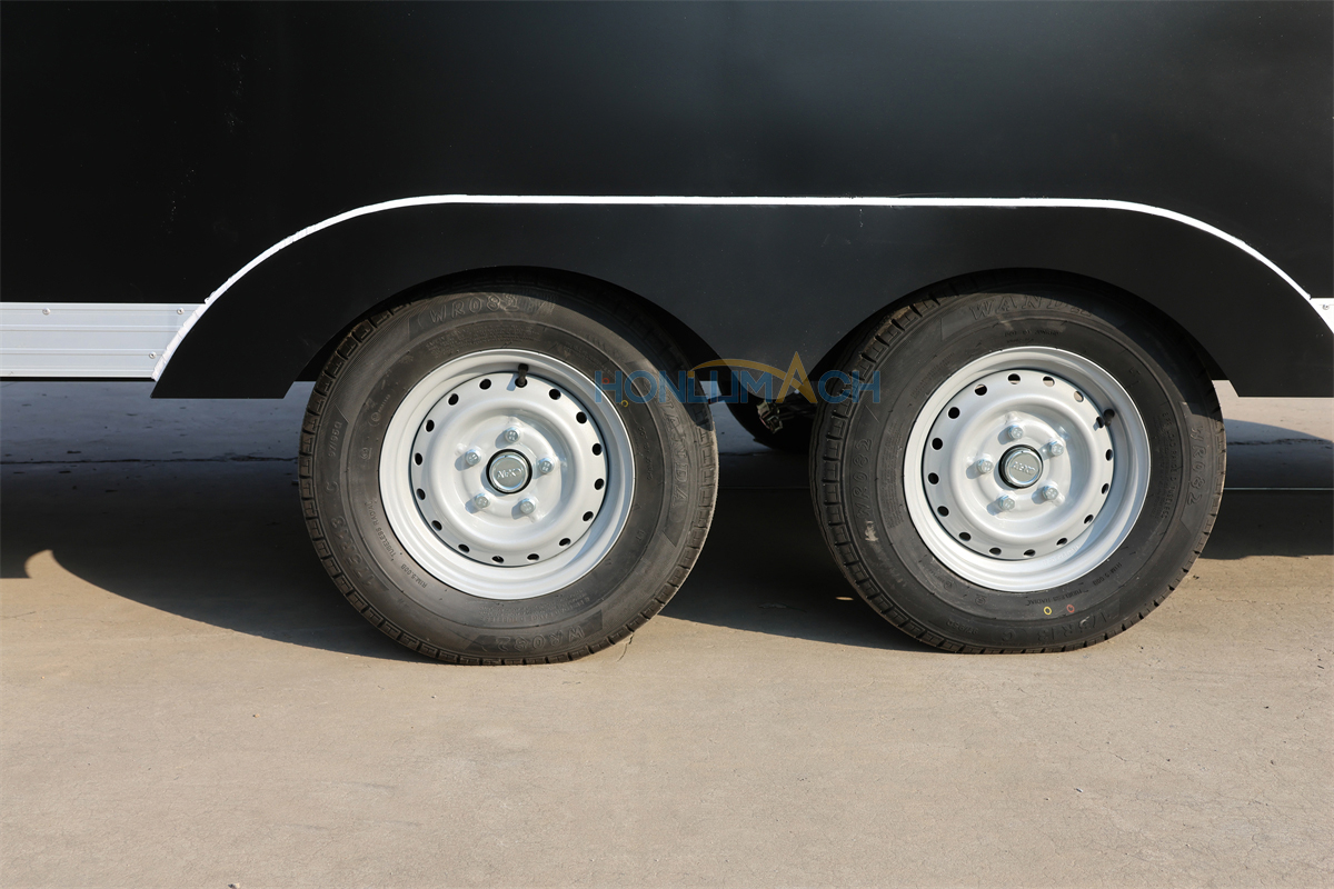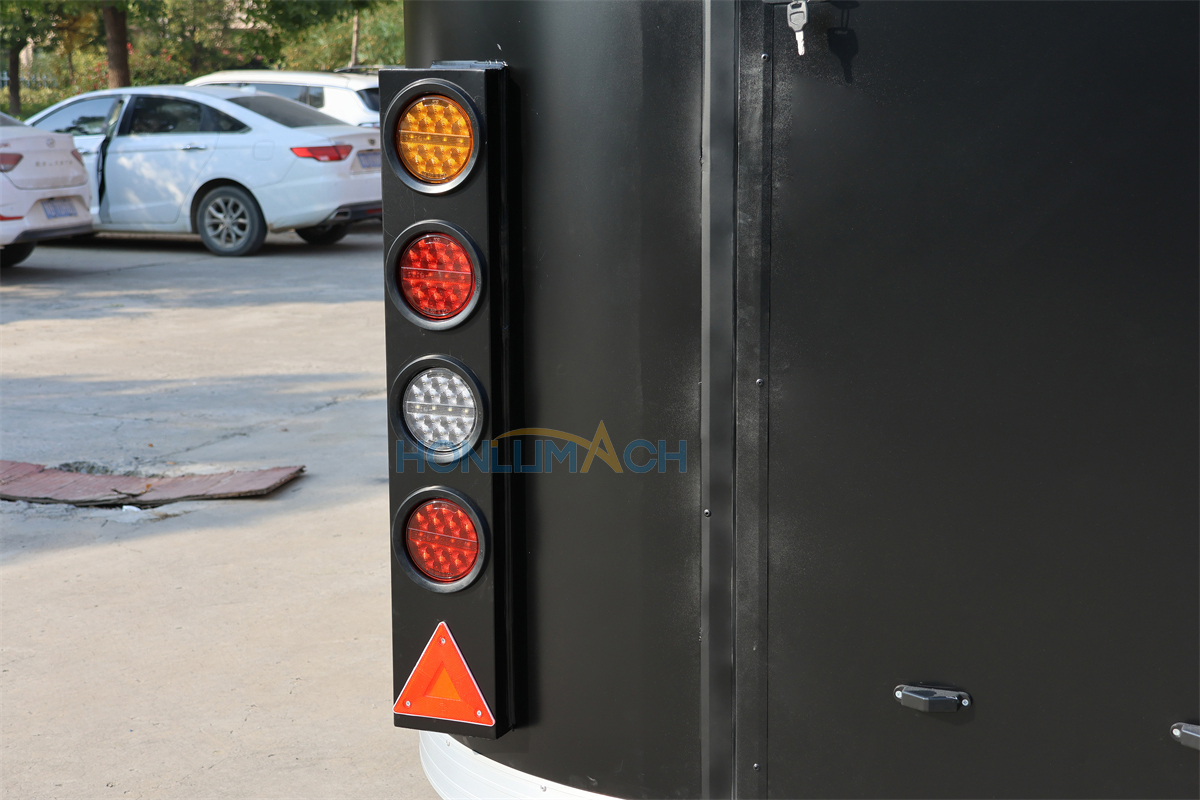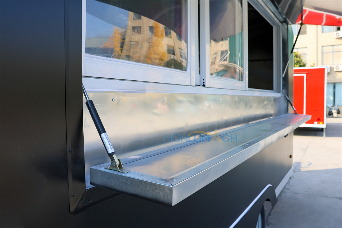 In front of the food trailer, we have made two big servie windows according to the customer’s requirements. That will be very convenient for guests who come to dine to order and pick up their meals. On the top of each window, we have installed a retractable awning. The awning will protect people from sunshine and rain, which is a thoughtful design. Next, let’s see the back view of this large food trailer.