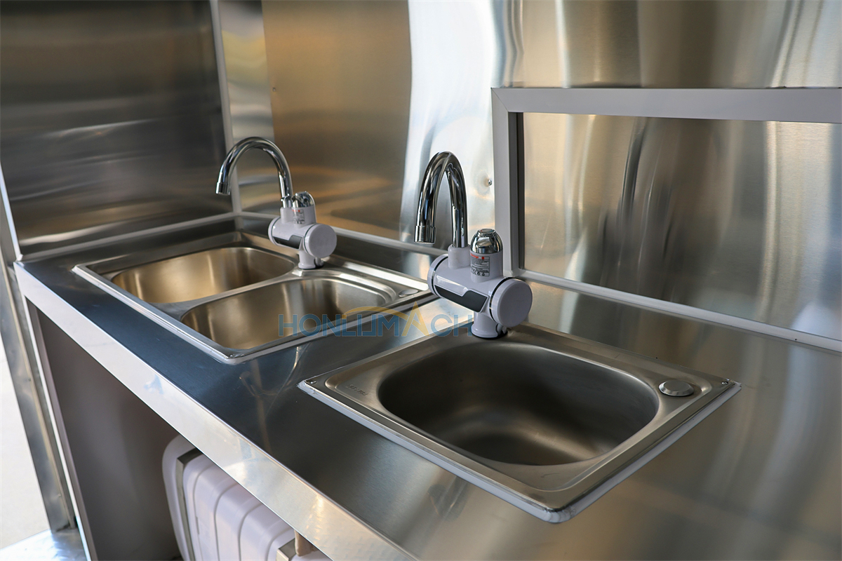 According to the customer’s requirements, we have equipped the 5m large catering trailer with kitchen equipment. In the following are some of the inner details of this trailer. There is a range hood, sinks, an air conditioner, a salad bar refrigerator, a gas stove, a gas fryer, a griddle, a grill, a storage cabinet, and a workbench, etc. Our customer will add some other equipment he needs after receiving the trailer.