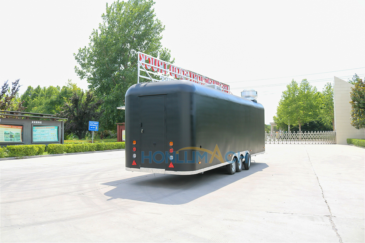 This is a custom-made mobile food truck from a US client, approximately 26 feet long. The entire vehicle’s appearance, color, pattern, and structure were customized to the client’s requirements. A custom-designed sign was also added to the roof at the client’s request, along with two custom windows with sunshades.