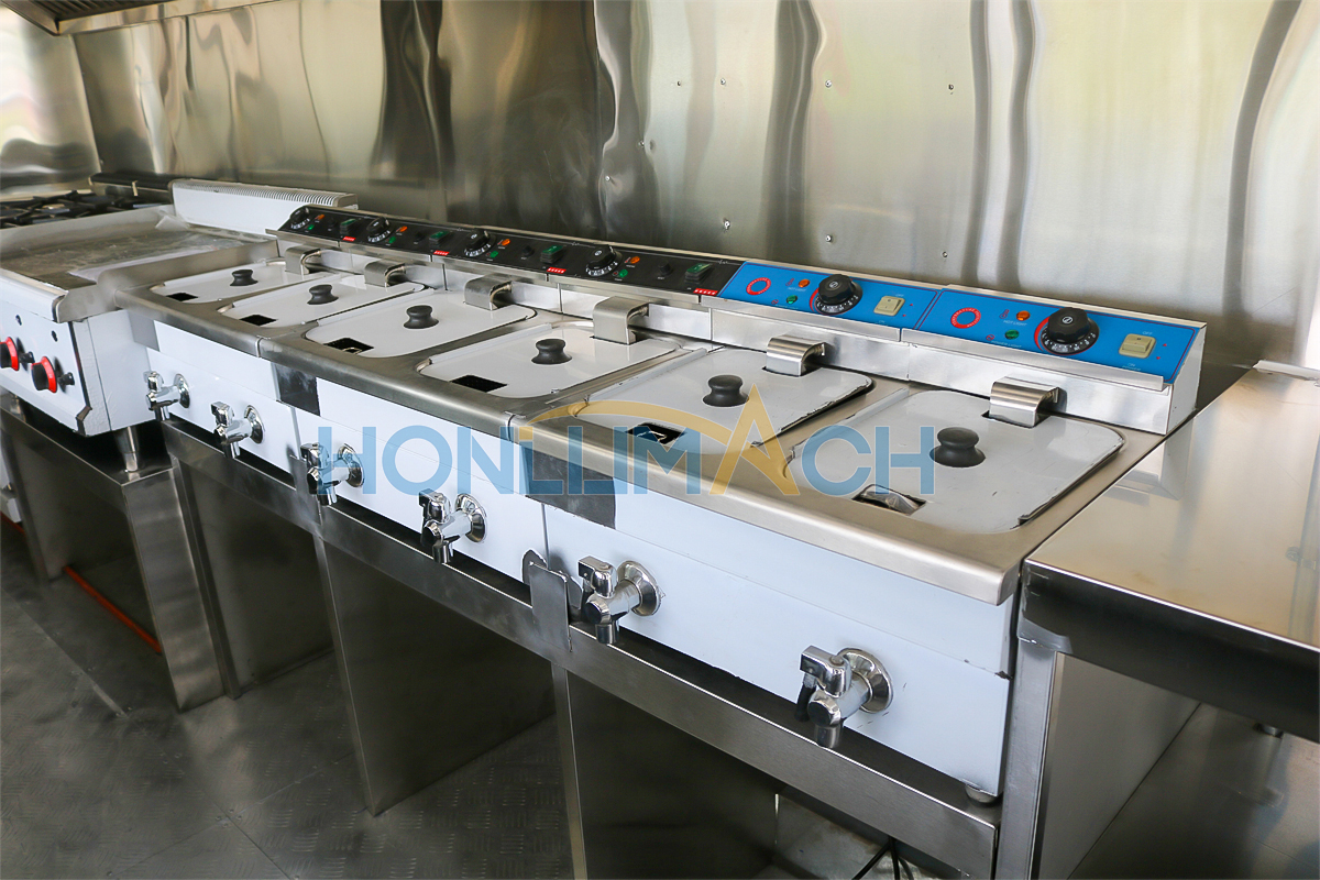 According to the customer’s requirements, we have equipped the 8m large catering trailer with kitchen equipment. In the following are some of the inner details of this trailer. There is a range hood, sinks, an air conditioner, a salad bar refrigerator, a gas stove, a gas fryer, a griddle, a grill, a storage cabinet, and a workbench. Our customer will add some other equipment he needs after receiving the trailer.