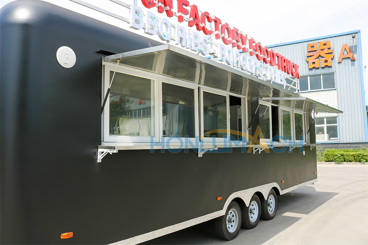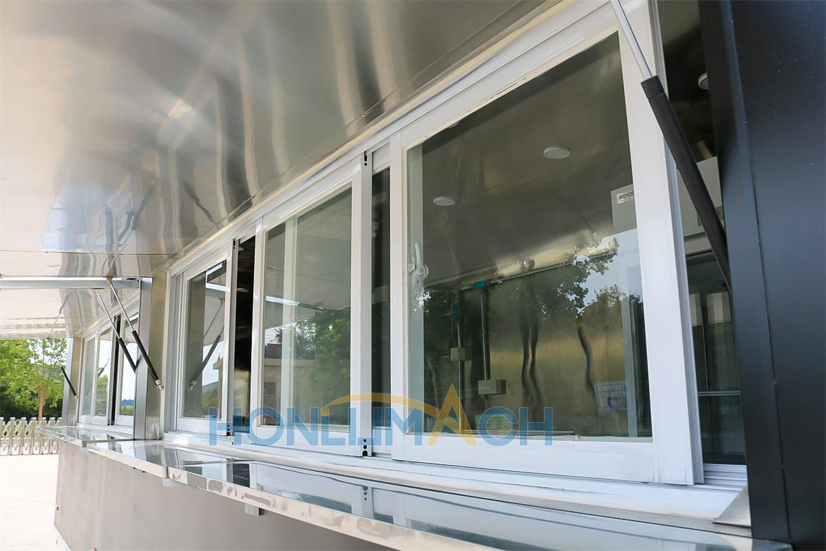 This is a custom-made mobile food truck from a US client, approximately 26 feet long. The entire vehicle’s appearance, color, pattern, and structure were customized to the client’s requirements. A custom-designed sign was also added to the roof at the client’s request, along with two custom windows with sunshades.