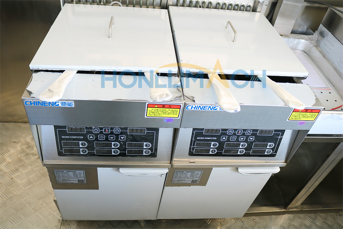 According to the customer’s requirements, we have equipped the 4.5m large catering trailer with kitchen equipment. In the following are some of the inner details of this trailer. There is a range hood, sinks, an air conditioner, a salad bar refrigerator, a gas stove, a gas fryer, a griddle, a grill, a storage cabinet, and a workbench, etc. Our customer will add some other equipment he needs after receiving the trailer.