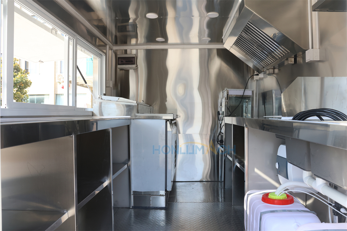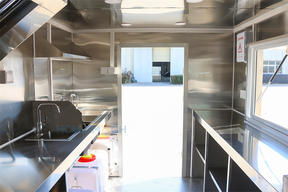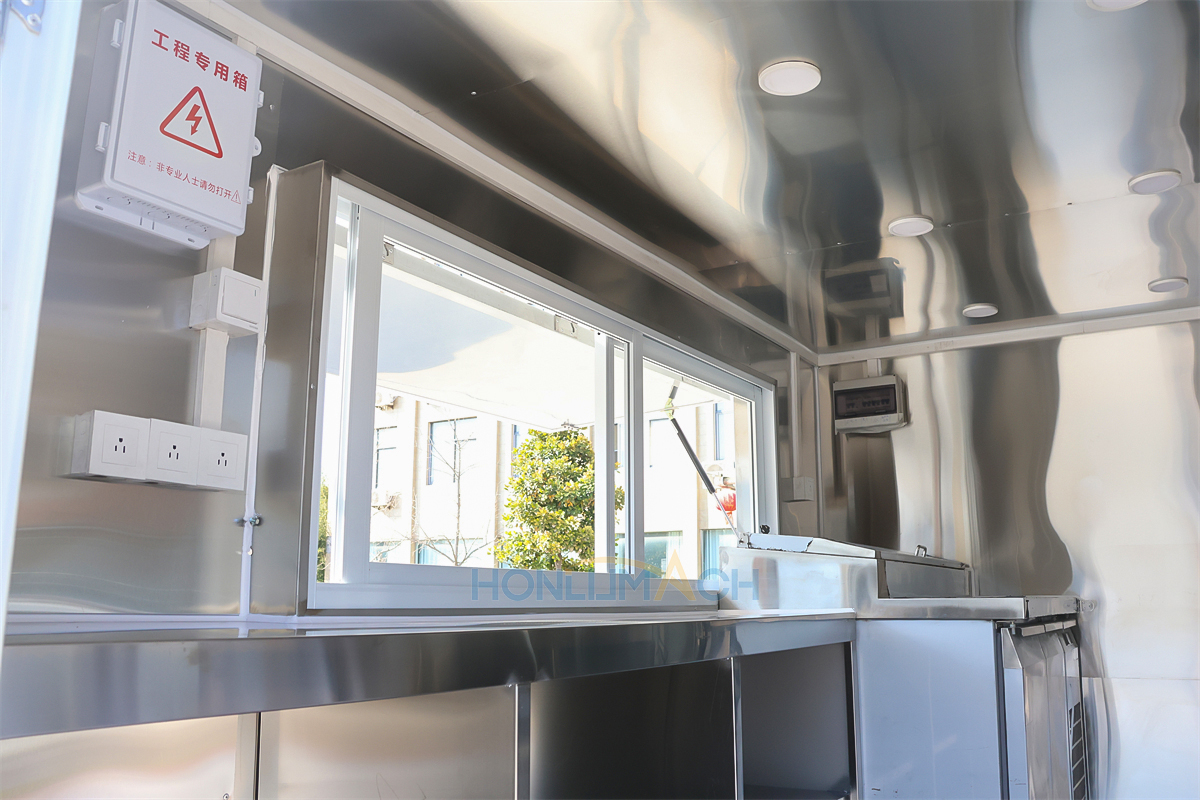 | Standard Configuration | 1) 201 Stainless steel interior wall, 2) 201 stainless steel workbench, 3) 304 Stainless steel sinks *2 4) hot & cold tap *1 5) 20L water basket *2 6) tire*4 7) jack*4 8) big service window * 1 9) socket*6 10) power switch More, customized |