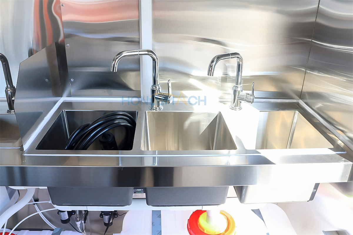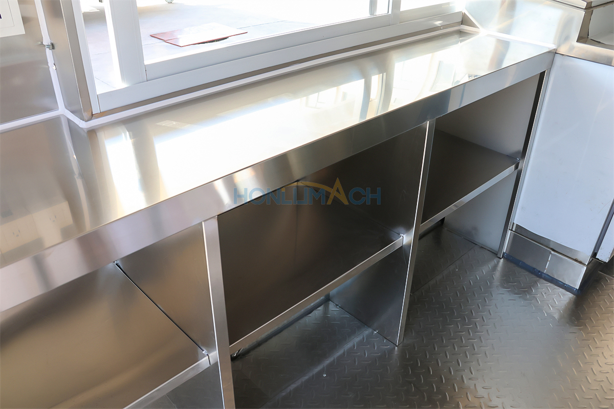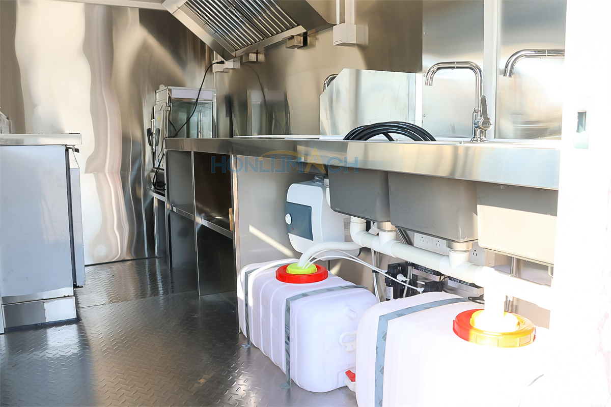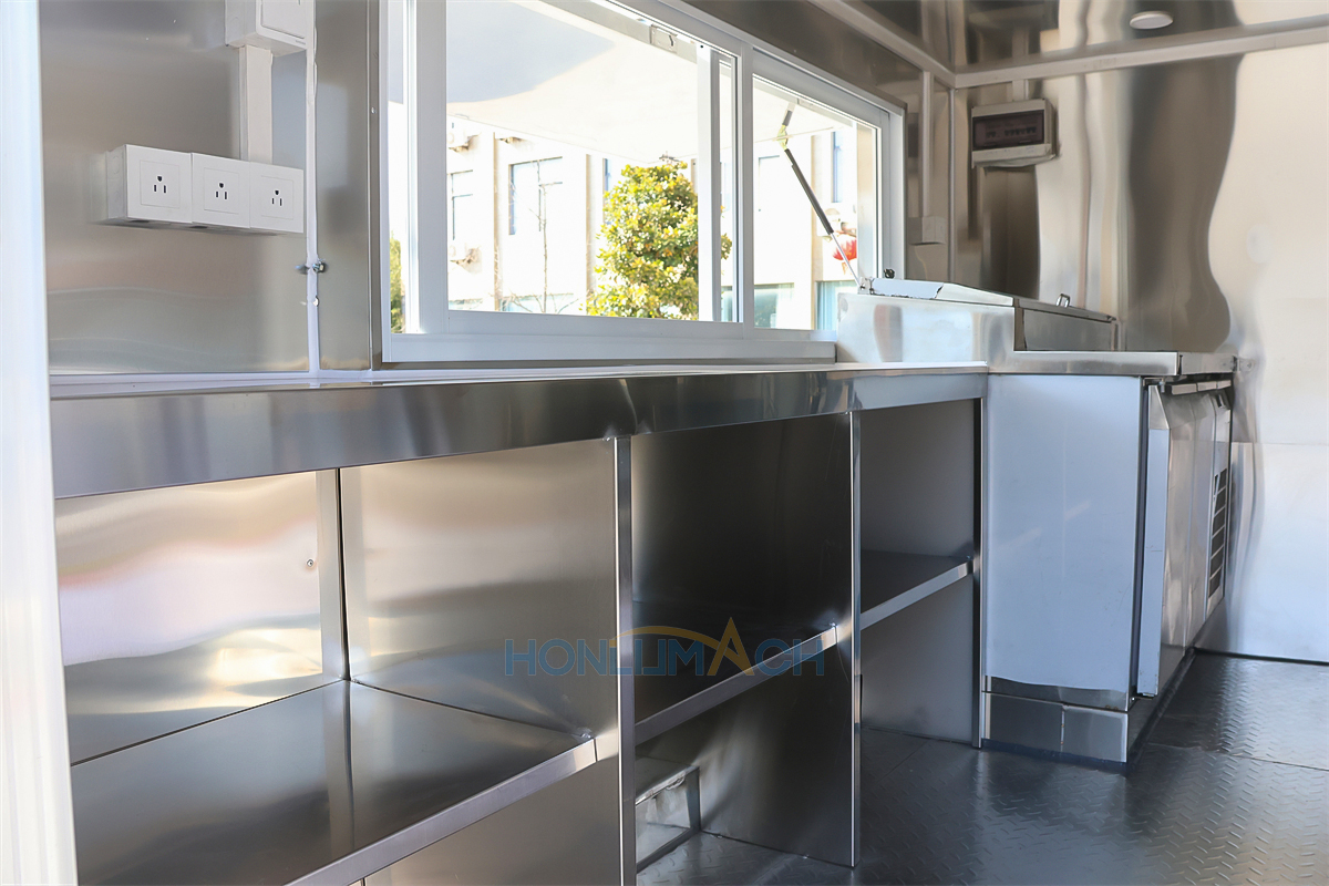 | Standard Configuration | 1) 201 Stainless steel interior wall, 2) 201 stainless steel workbench, 3) 304 Stainless steel sinks *2 4) hot & cold tap *1 5) 20L water basket *2 6) tire*4 7) jack*4 8) big service window * 1 9) socket*6 10) power switch More, customized |
