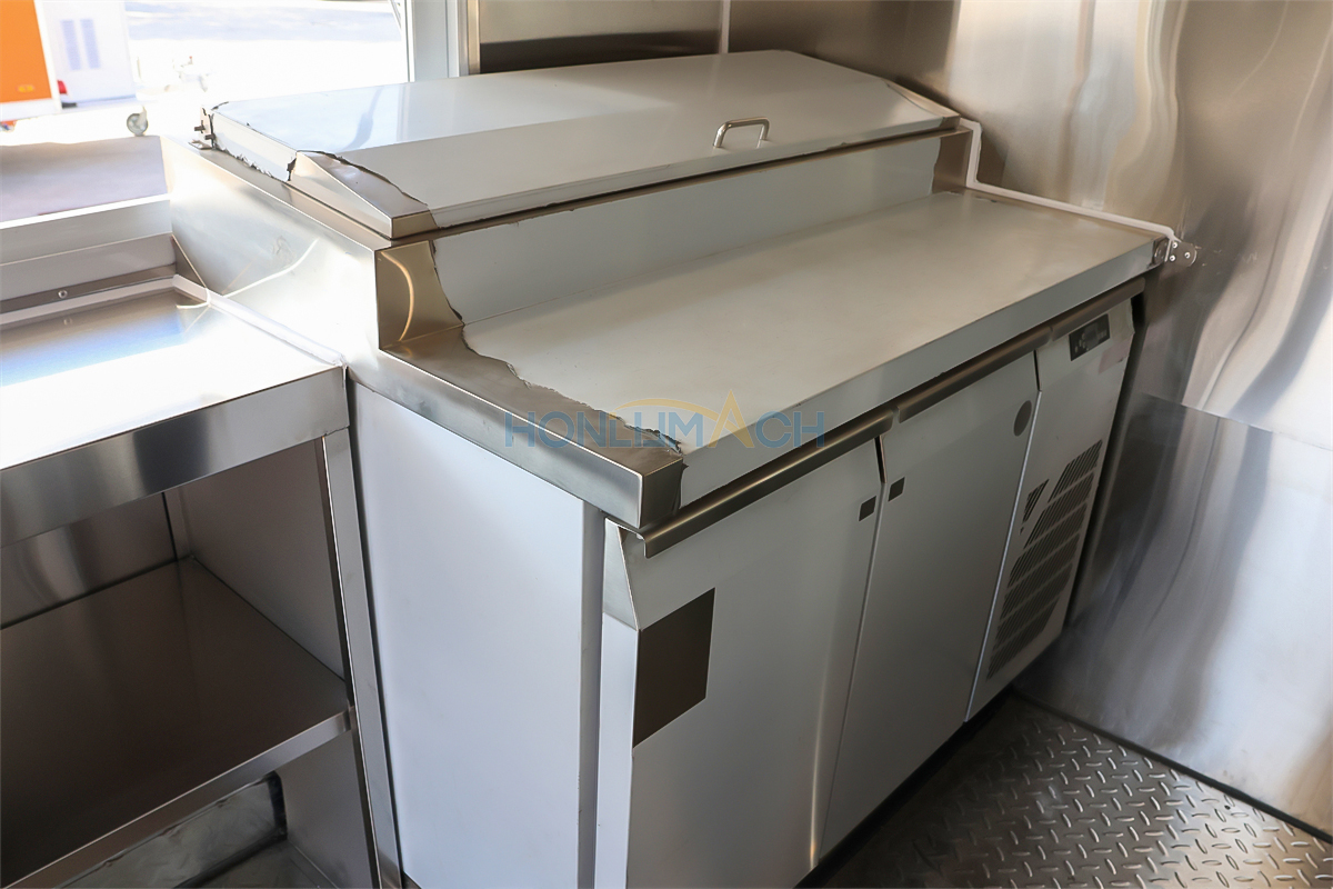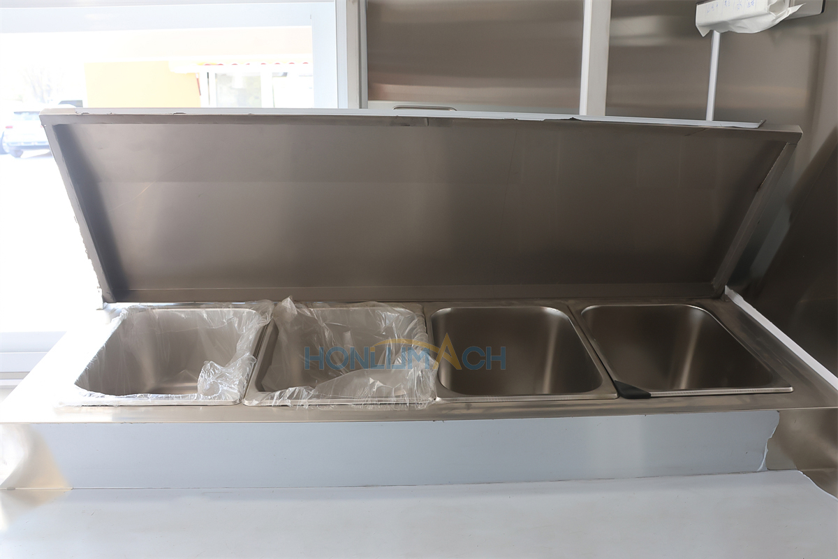 According to the customer’s requirements, we have equipped the 3.5m large catering trailer with kitchen equipment. In the following are some of the inner details of this trailer. There is a range hood, sinks, an air conditioner, a salad bar refrigerator, a gas stove, a gas fryer, a griddle, a grill, a storage cabinet, and a workbench, etc. Our customer will add some other equipment he needs after receiving the trailer.