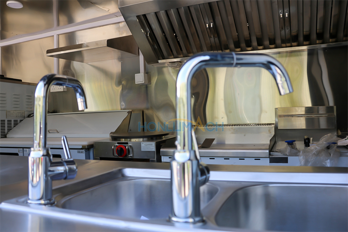 2) 201 stainless steel workbench, 3) 304 Stainless steel sinks *2 4) hot & cold tap *1 5) 20L water basket *2 6) tire*4 7) jack*4 8) big service window * 1 9) socket*6 10) power switch More, customized |