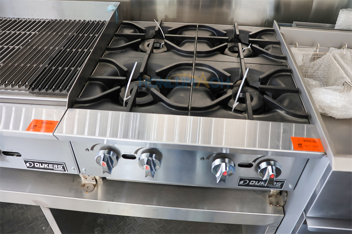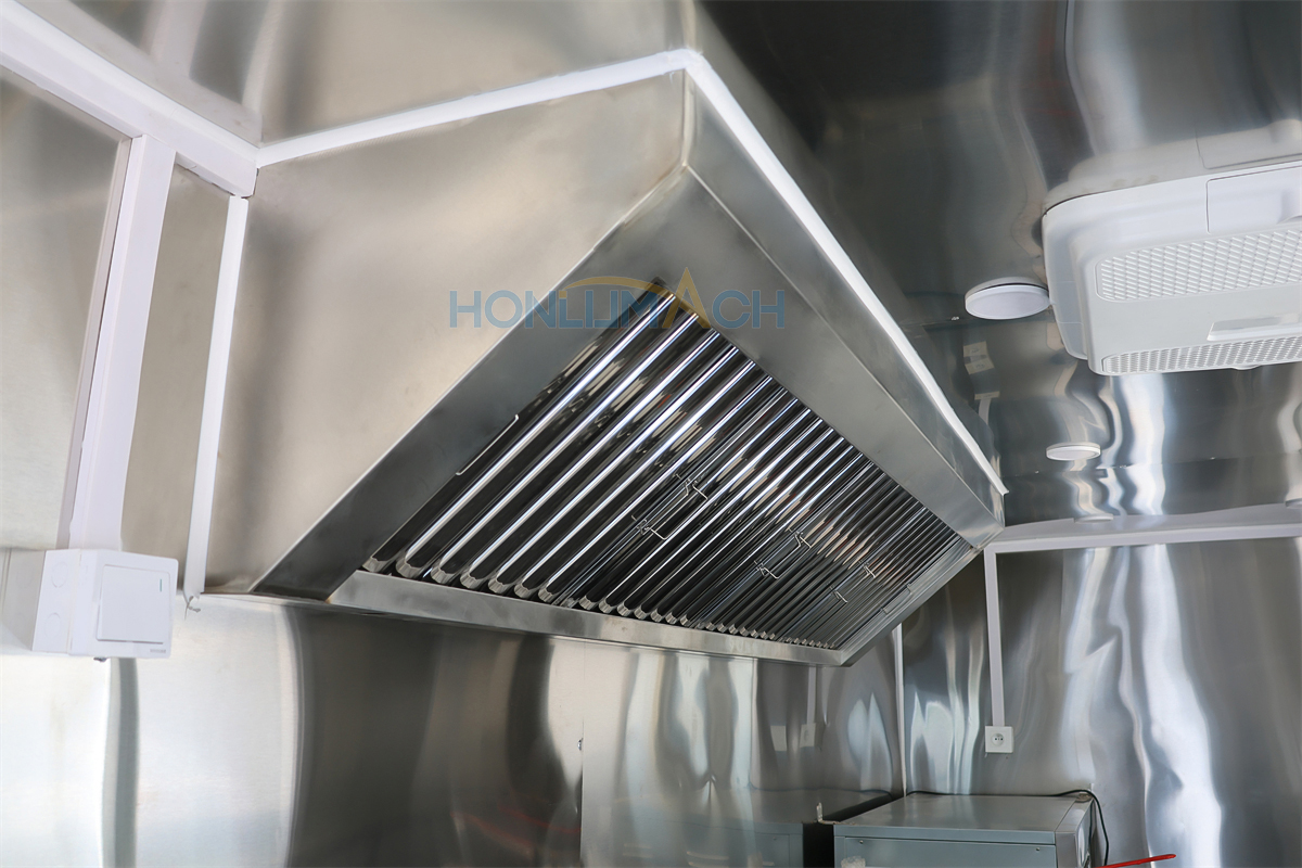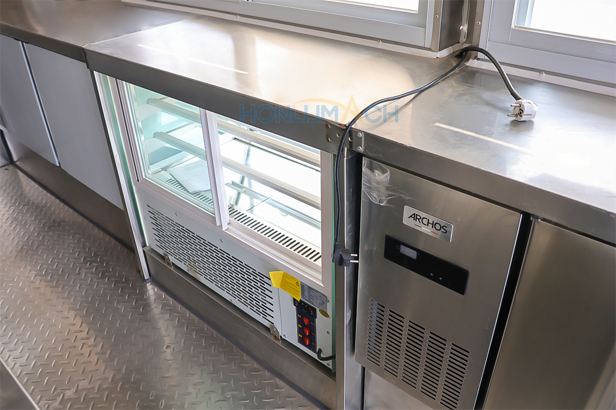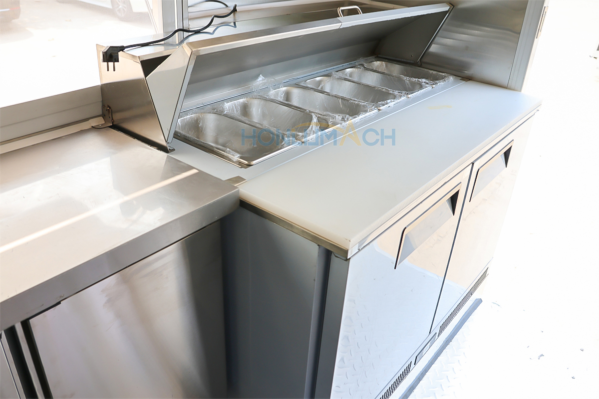 According to the customer’s requirements, we have equipped the 5m large catering trailer with kitchen equipment. In the following are some of the inner details of this trailer. There is a range hood, sinks, an air conditioner, a salad bar refrigerator, a gas stove, a gas fryer, a griddle, a grill, a storage cabinet, and a workbench, etc. Our customer will add some other equipment he needs after receiving the trailer.