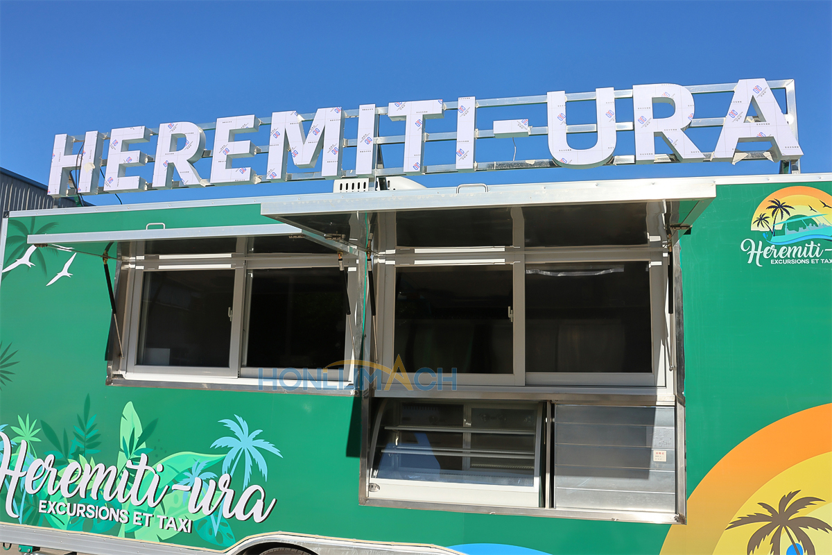 This is a 16.4ft large catering trailer we have customized for a customer from Slovakia. We manufacture it according to the customer’s requirements. As we can see from the picture below, it has an appealing signboard and will shine in the night.