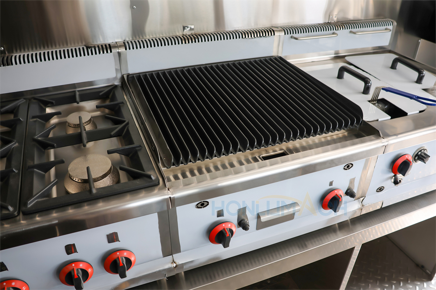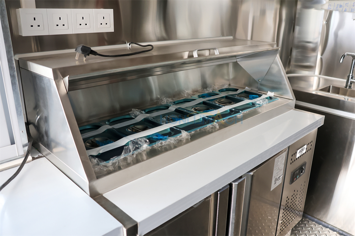 According to the customer’s requirements, we have equipped the 5m large catering trailer with kitchen equipment. In the following are some of the inner details of this trailer. There is a range hood, sinks, an air conditioner, a salad bar refrigerator, a gas stove, a gas fryer, a griddle, a grill, a storage cabinet, and a workbench, etc. Our customer will add some other equipment he needs after receiving the trailer.