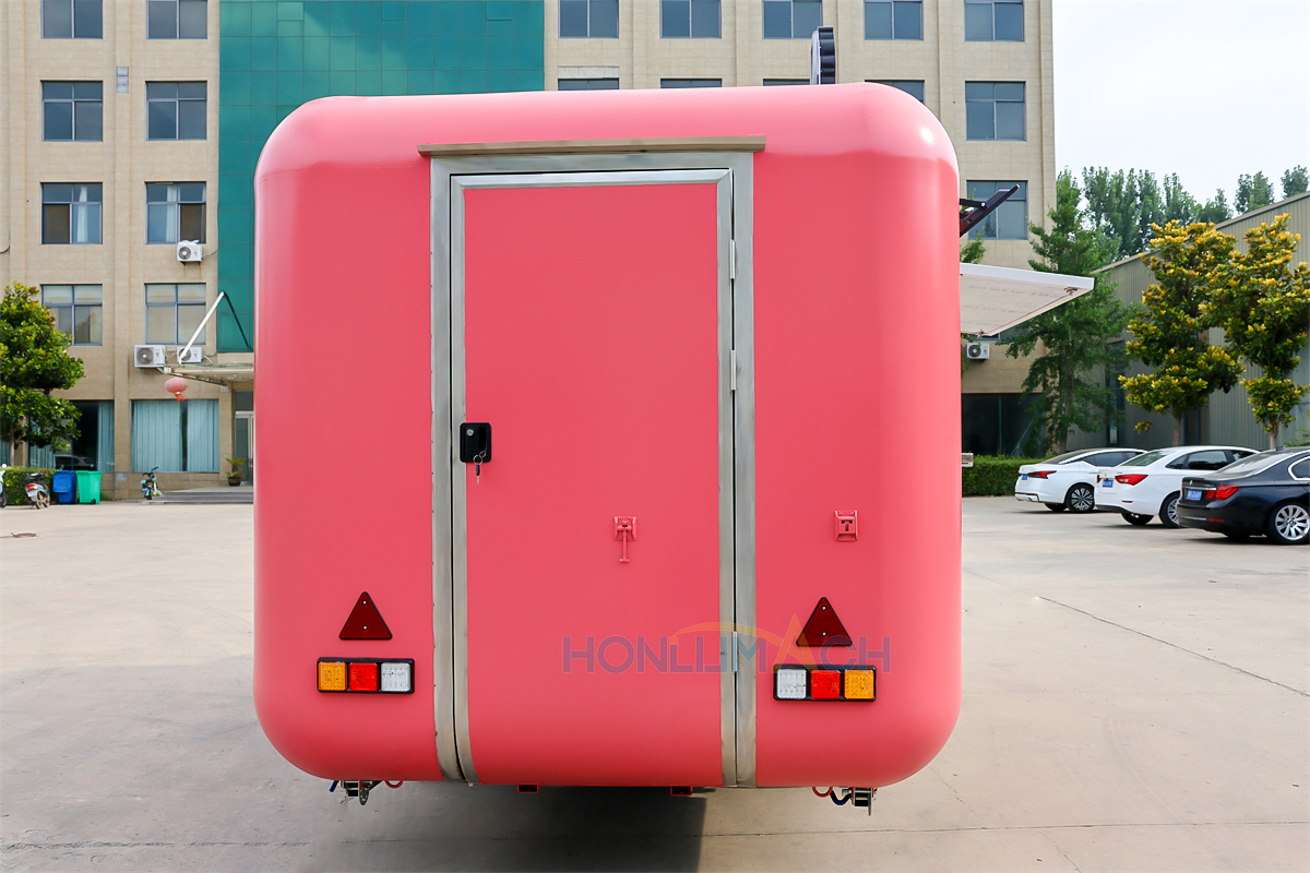 In the front of the food trailer, we have made two big servie windows according to the customer’s requirements. That will be very convenient for guests who come to dine to order and pick up their meals. On the top of each window, we have installed a retractable awning. The awning will protect people from sunshine and rain, which is a thoughtful design. Next, let’s see the back view of this large food trailer.