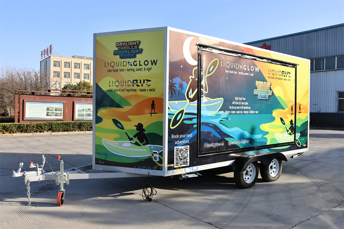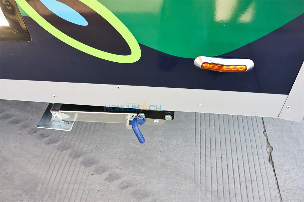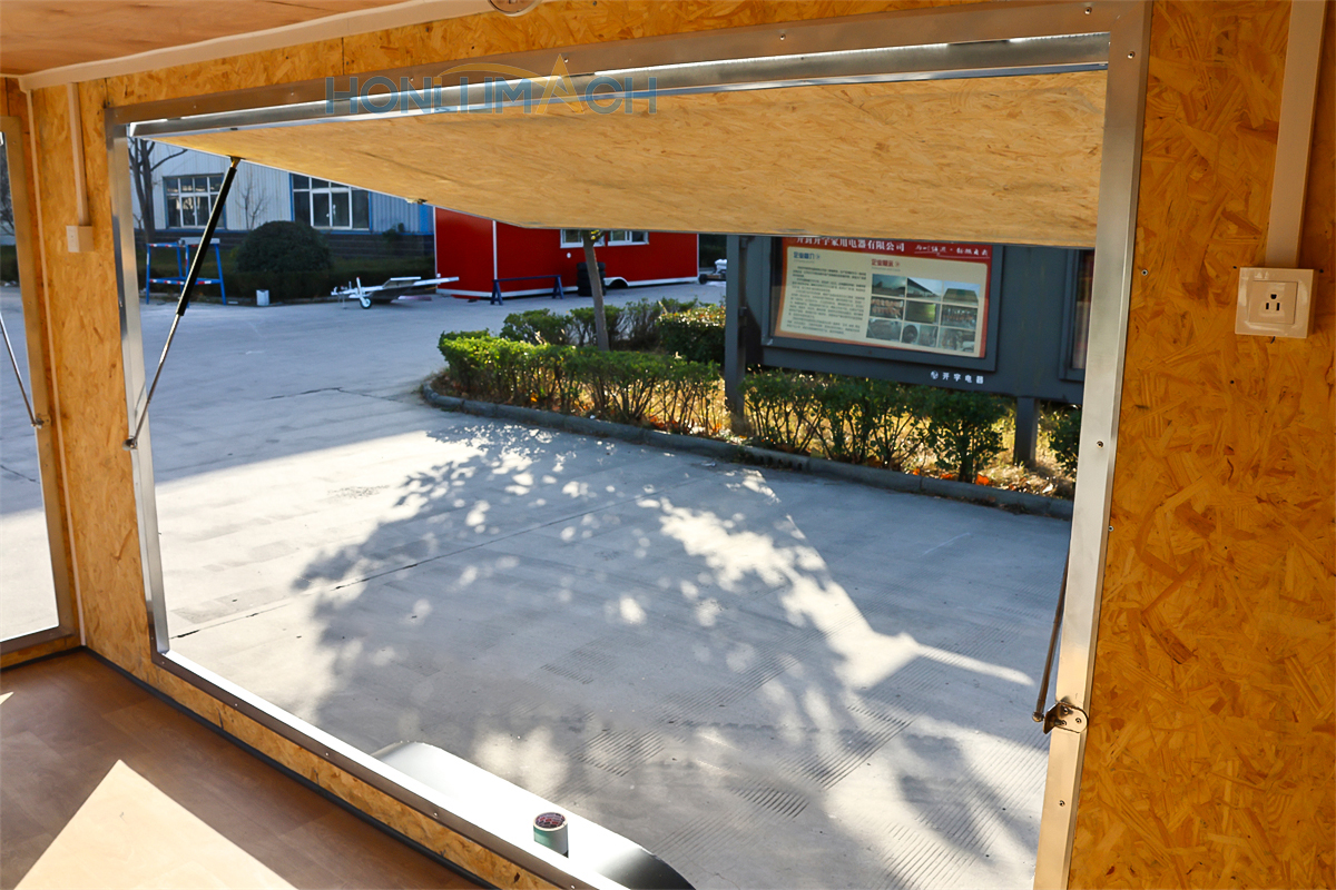 In the front of the food trailer, we have made two big servie windows according to the customer’s requirements. That will be very convenient for guests who come to dine to order and pick up their meals. On the top of each window, we have installed a retractable awning. The awning will protect people from sunshine and rain, which is a thoughtful design. Next, let’s see the back view of this large food trailer.