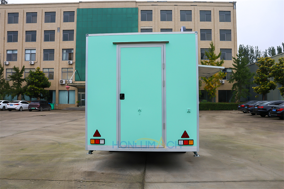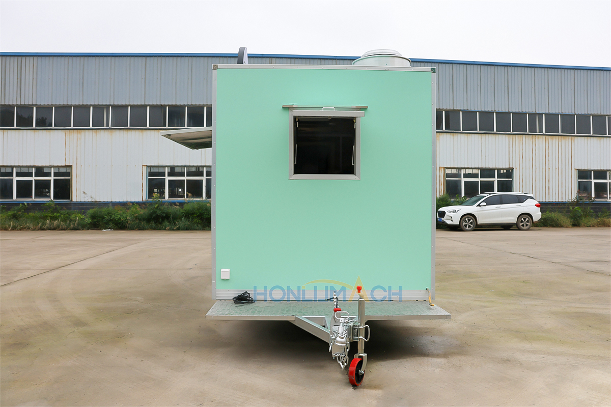 In the front of the food trailer, we have made two big servie windows according to the customer’s requirements. That will be very convenient for guests who come to dine to order and pick up their meals. On the top of each window, we have installed a retractable awning. The awning will protect people from sunshine and rain, which is a thoughtful design. Next, let’s see the back view of this large food trailer.