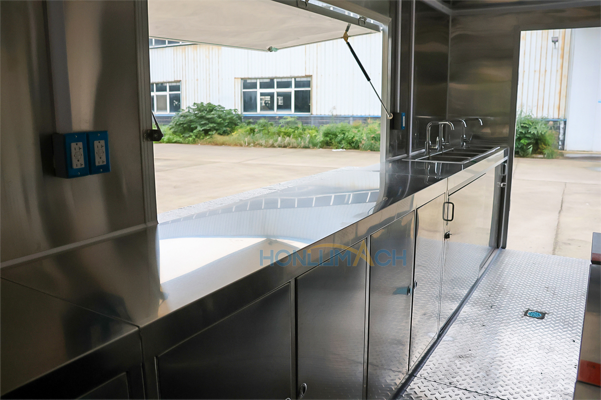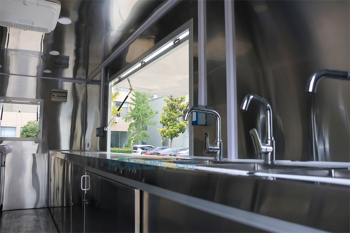 | Standard Configuration | 1) 201 Stainless steel interior wall, 2) 201 stainless steel workbench, 3) 304 Stainless steel sinks *2 4) hot & cold tap *1 5) 20L water basket *2 6) tire*4 7) jack*4 8) big service window * 1 9) socket*6 10) power switch More, customized |