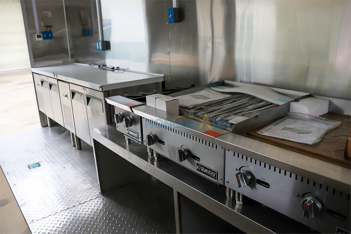 According to the customer’s requirements, we have equipped the 5m large catering trailer with kitchen equipment. In the following are some of the inner details of this trailer. There is a range hood, sinks, an air conditioner, a salad bar refrigerator, a gas stove, a gas fryer, a griddle, a grill, a storage cabinet, and a workbench, etc. Our customer will add some other equipment he needs after receiving the trailer.