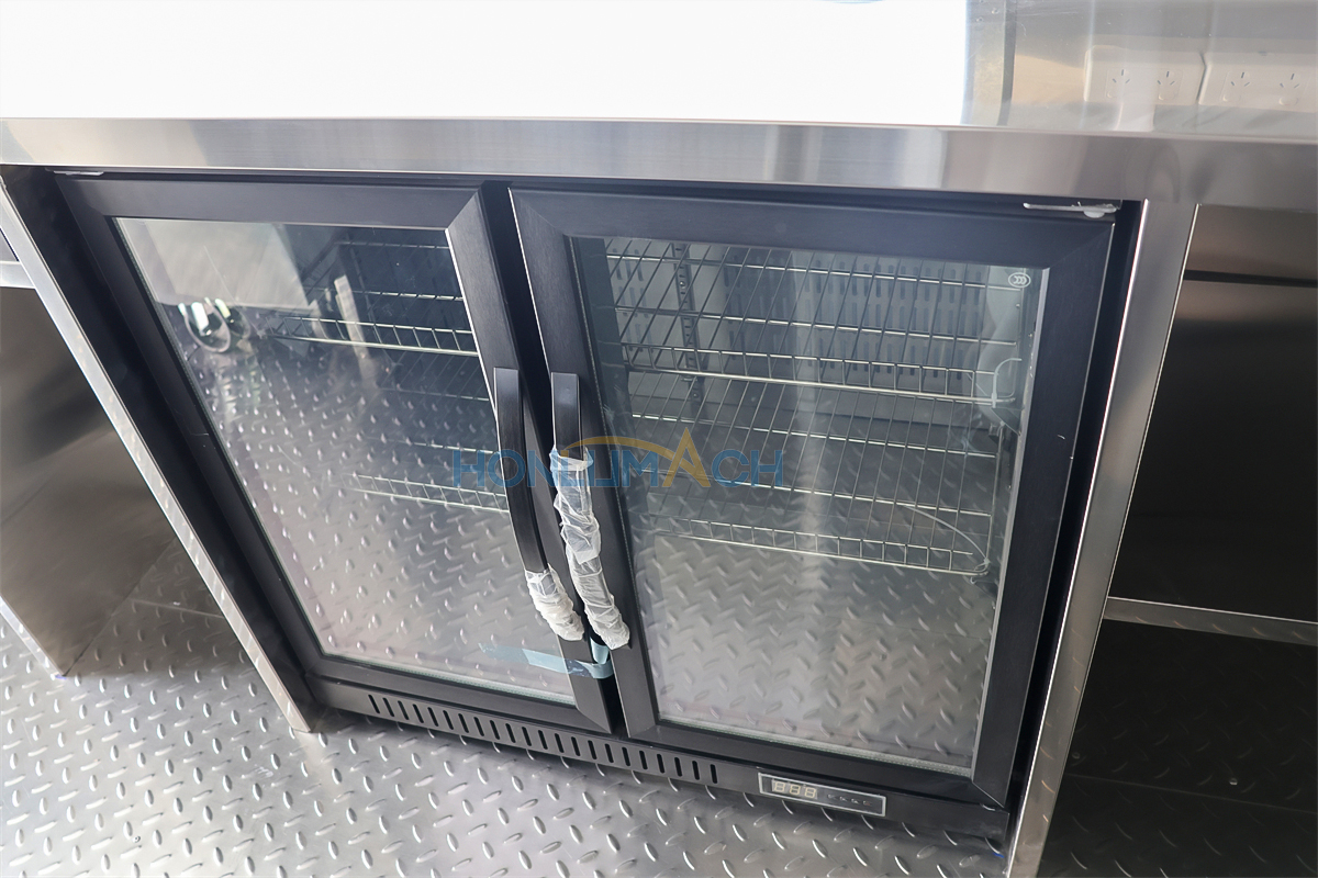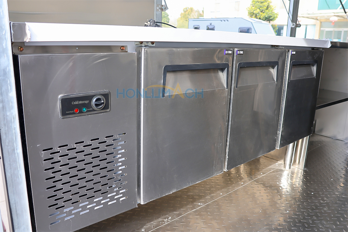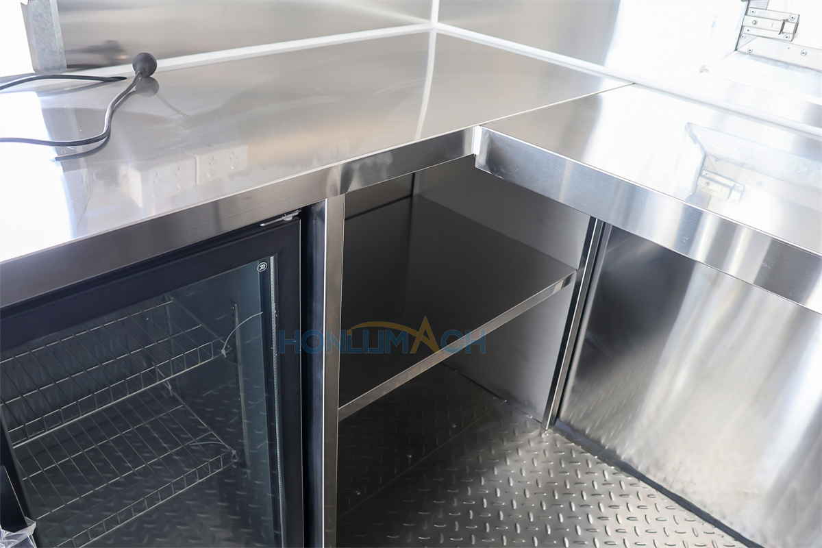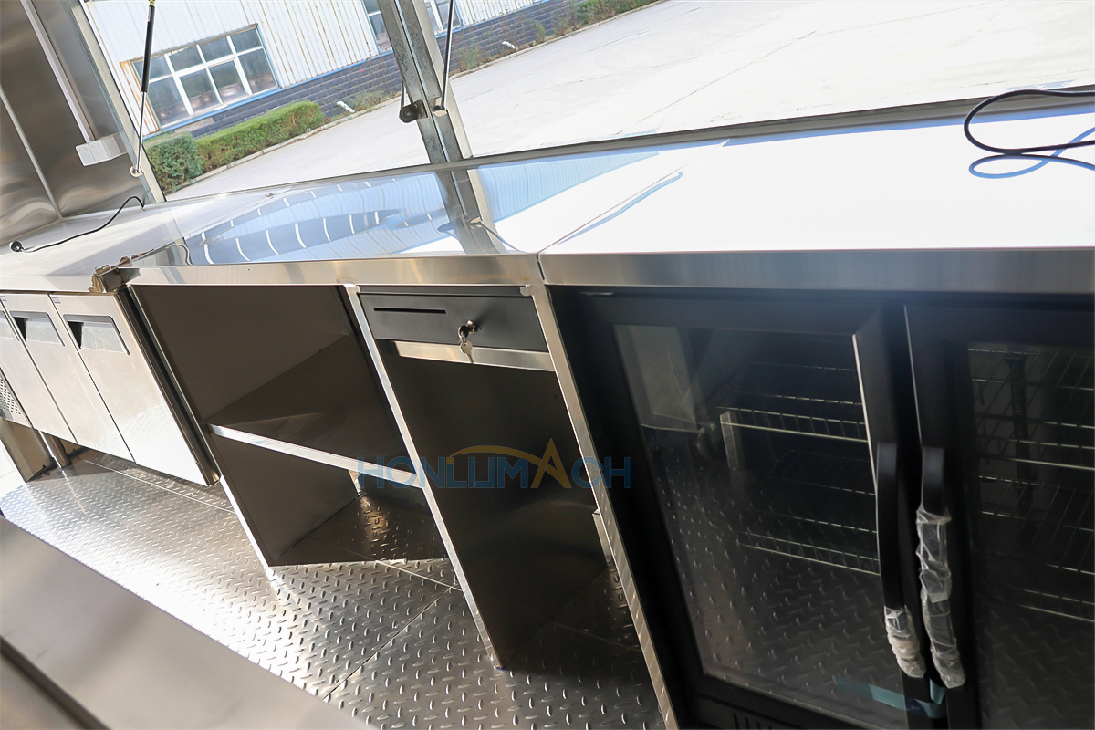 According to the customer’s requirements, we have equipped the 5m large catering trailer with kitchen equipment. In the following are some of the inner details of this trailer. There is a range hood, sinks, an air conditioner, a salad bar refrigerator, a gas stove, a gas fryer, a griddle, a grill, a storage cabinet, and a workbench, etc. Our customer will add some other equipment he needs after receiving the trailer.