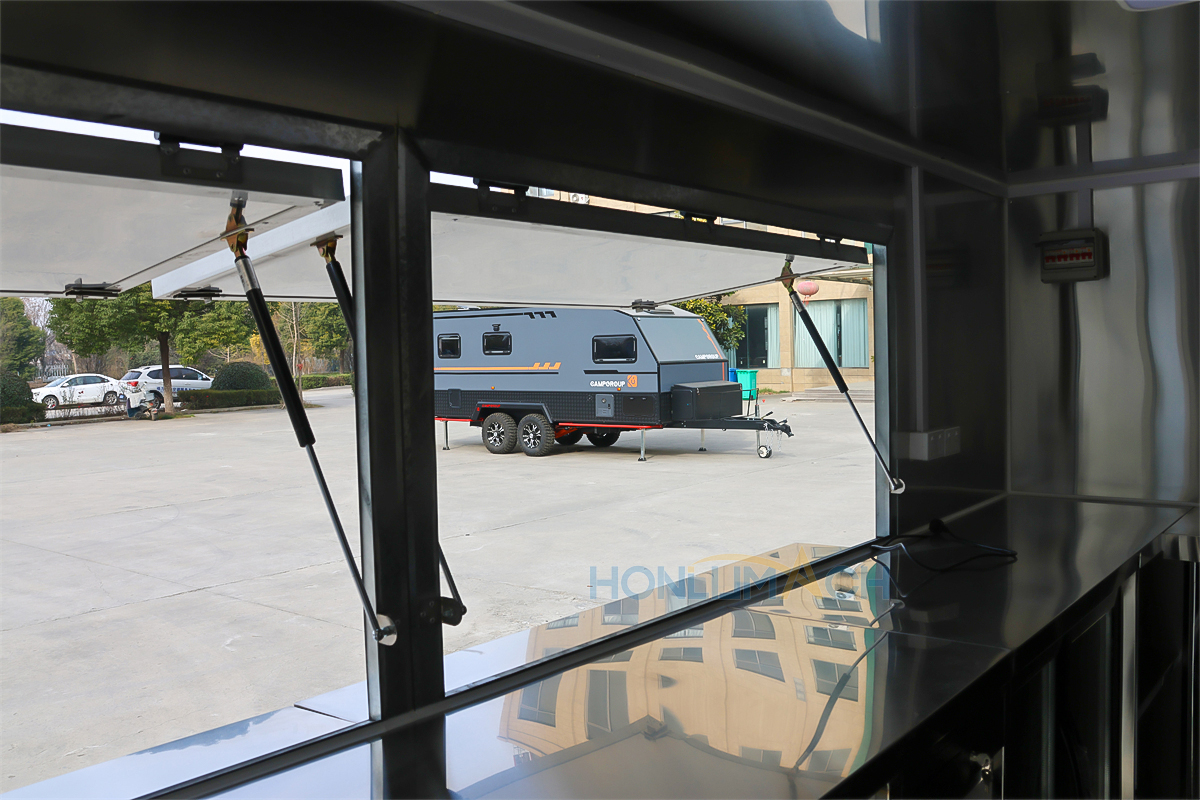 In the front of the food trailer, we have made two big servie windows according to the customer’s requirements. That will be very convenient for guests who come to dine to order and pick up their meals. On the top of each window, we have installed a retractable awning. The awning will protect people from sunshine and rain, which is a thoughtful design. Next, let’s see the back view of this large food trailer.
