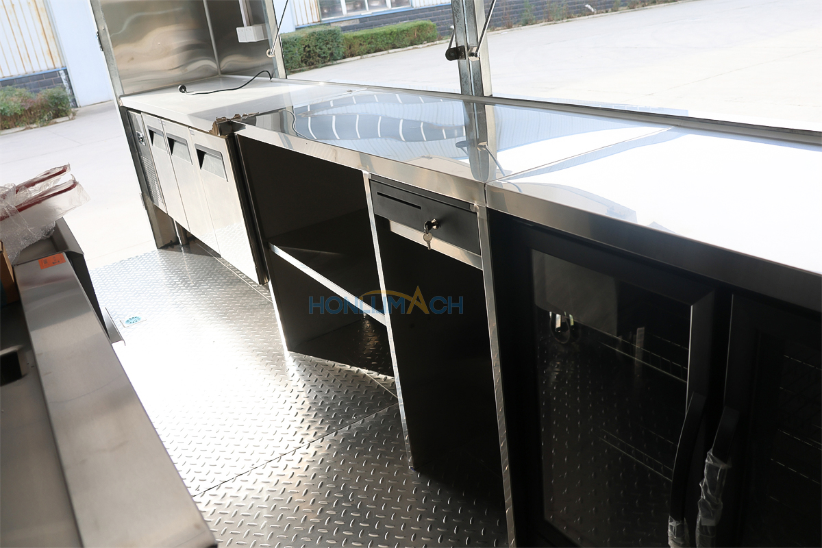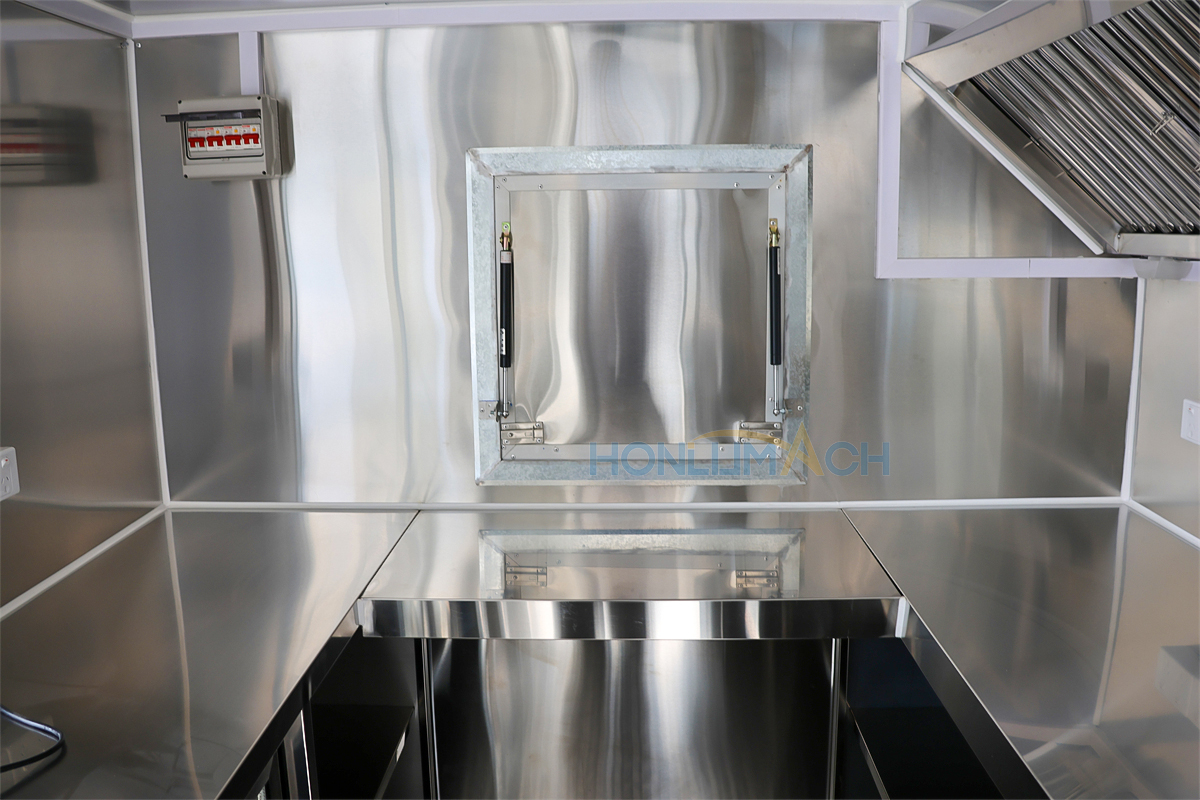 | Standard Configuration | 1) 201 Stainless steel interior wall, 2) 201 stainless steel workbench, 3) 304 Stainless steel sinks *2 4) hot & cold tap *1 5) 20L water basket *2 6) tire*4 7) jack*4 8) big service window * 1 9) socket*6 10) power switch More, customized |