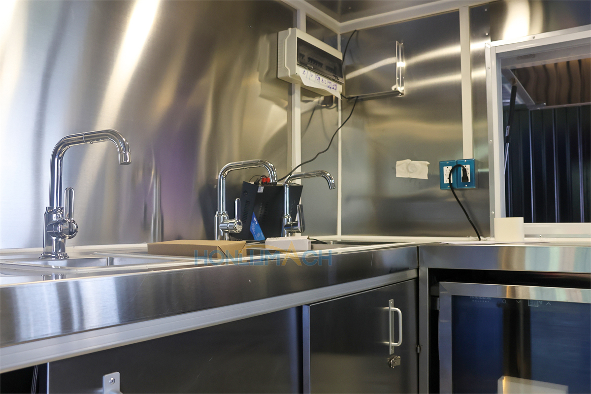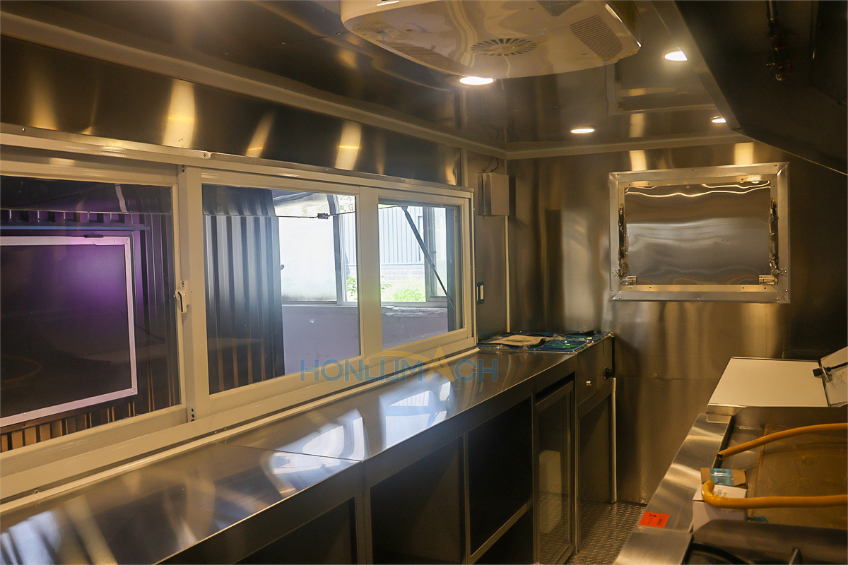 | Standard Configuration | 1) 201 Stainless steel interior wall, 2) 201 stainless steel workbench, 3) 304 Stainless steel sinks *2 4) hot & cold tap *1 5) 20L water basket *2 6) tire*4 7) jack*4 8) big service window * 1 9) socket*6 10) power switch More, customized |