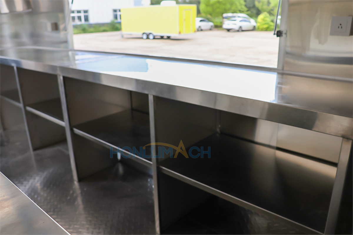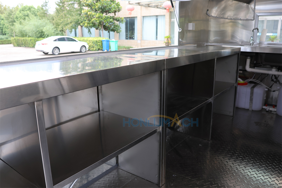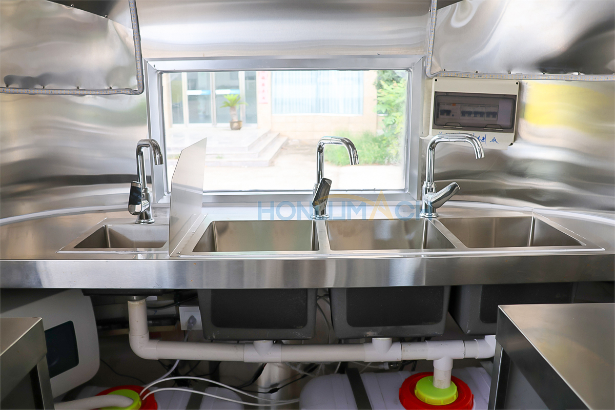 | Standard Configuration | 1) 201 Stainless steel interior wall, 2) 201 stainless steel workbench, 3) 304 Stainless steel sinks *2 4) hot & cold tap *1 5) 20L water basket *2 6) tire*4 7) jack*4 8) big service window * 1 9) socket*6 10) power switch More, customized |