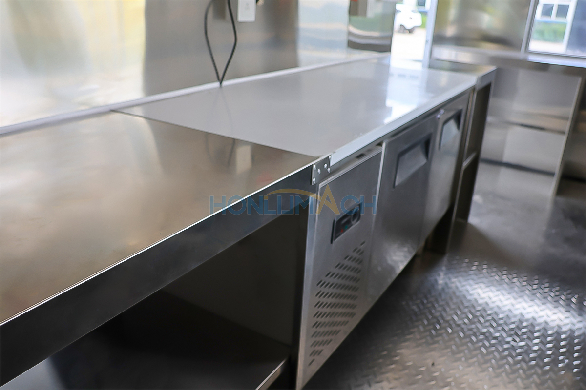 According to the customer’s requirements, we have equipped the 16ft stainless steel commercial kitchen with kitchen equipment. The following are some of the inner details of this trailer. There are range hood, gas griddle, gas fryer, sinks, salad bar refrigerator, electric crepe maker, monitor, food display cabinet, etc.