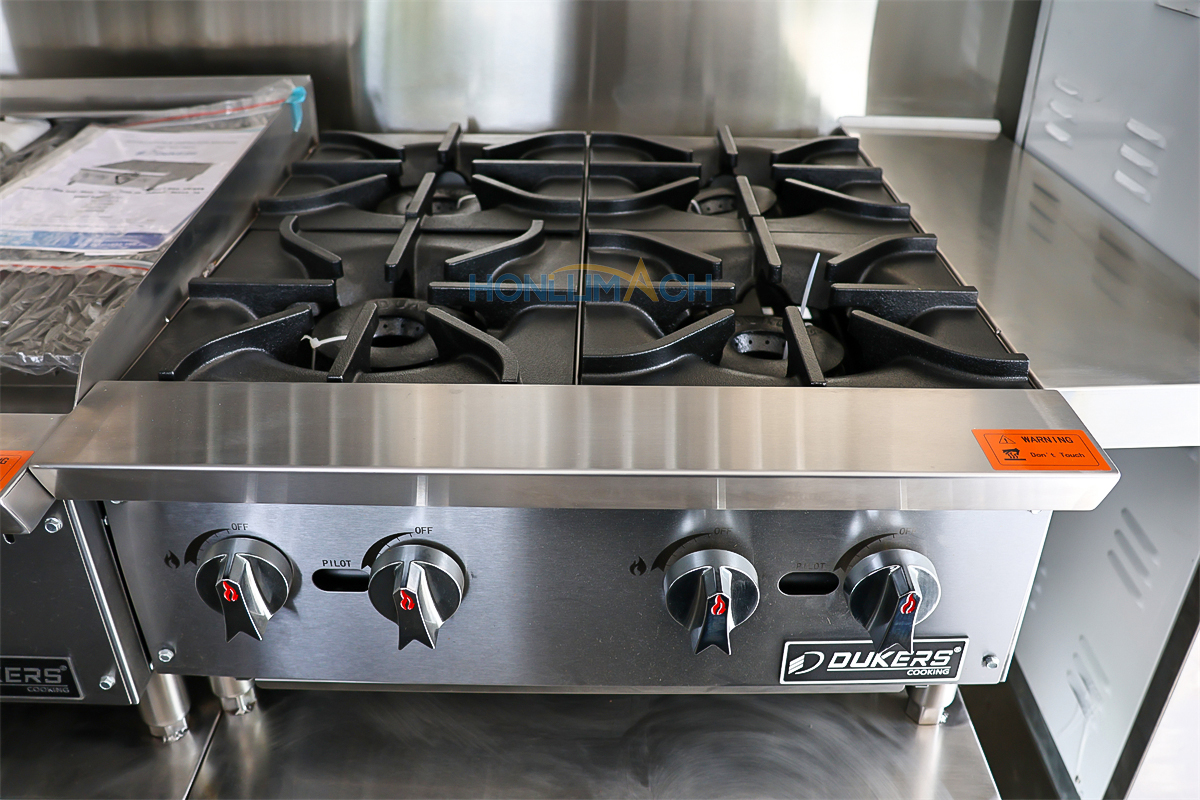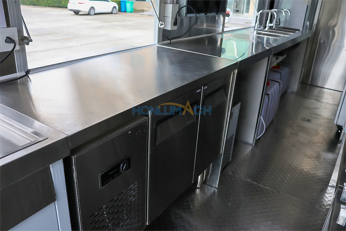 According to the customer’s requirements, we have equipped the 5.7m food truck with kitchen equipment. In the following are some of the inner details of this trailer. There are a range hood, an air conditioner, a gas griddle, a gas stove, a gas fryer, sinks, refrigerators, a shawarma machine, a dough mixer, a pancake machine, etc.