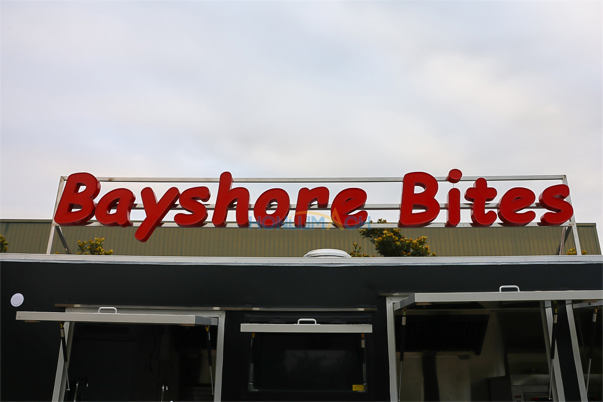 This is an 18.7 ft mobile food trailer we have customized for a customer from Canada. As we can see from the picture below, it has two big service windows in the front. Beside each window, there is a menu board. The custom-designed illuminated sign on the roof of the food truck shines even at night.