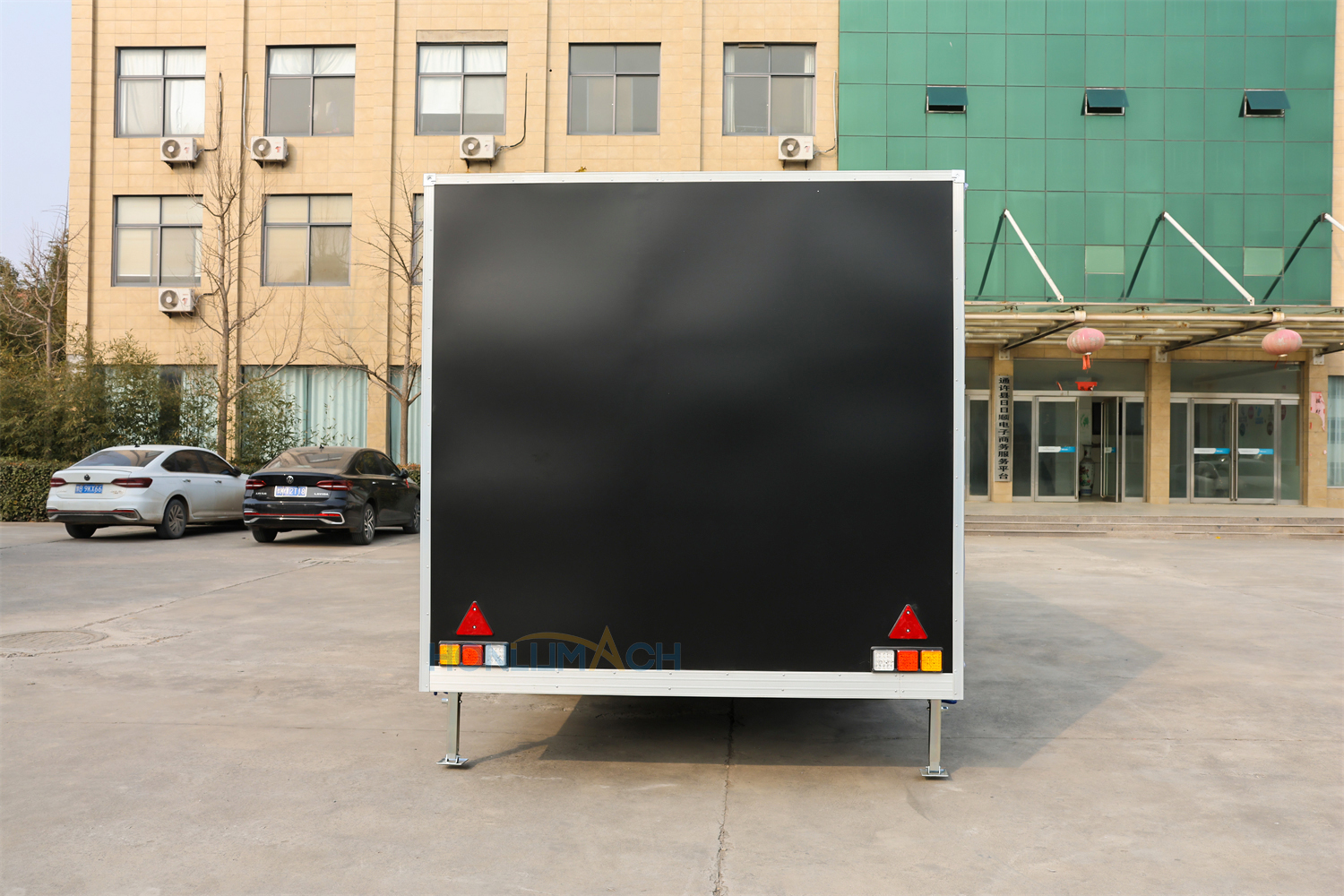 In the front of the food trailer, we have made two big servie windows according to the customer’s requirements. That will be very convenient for guests who come to dine to order and pick up their meals. On the top of each window, we have installed a retractable awning. The awning will protect people from sunshine and rain, which is a thoughtful design. Next, let’s see the back view of this large food trailer.