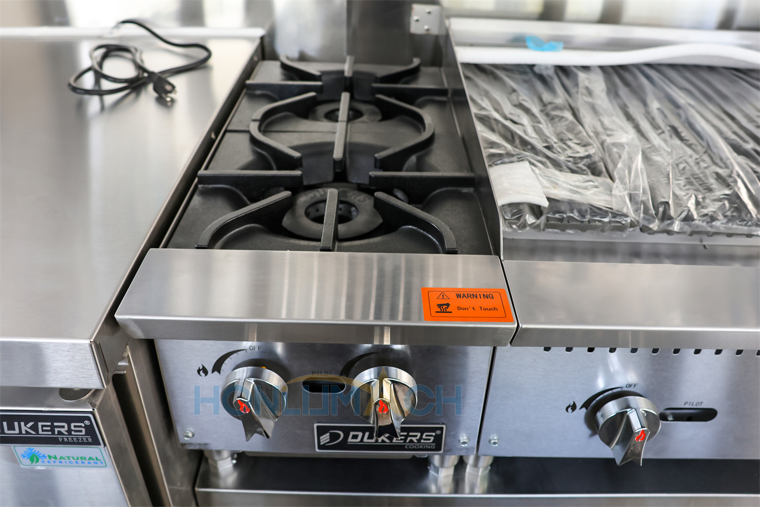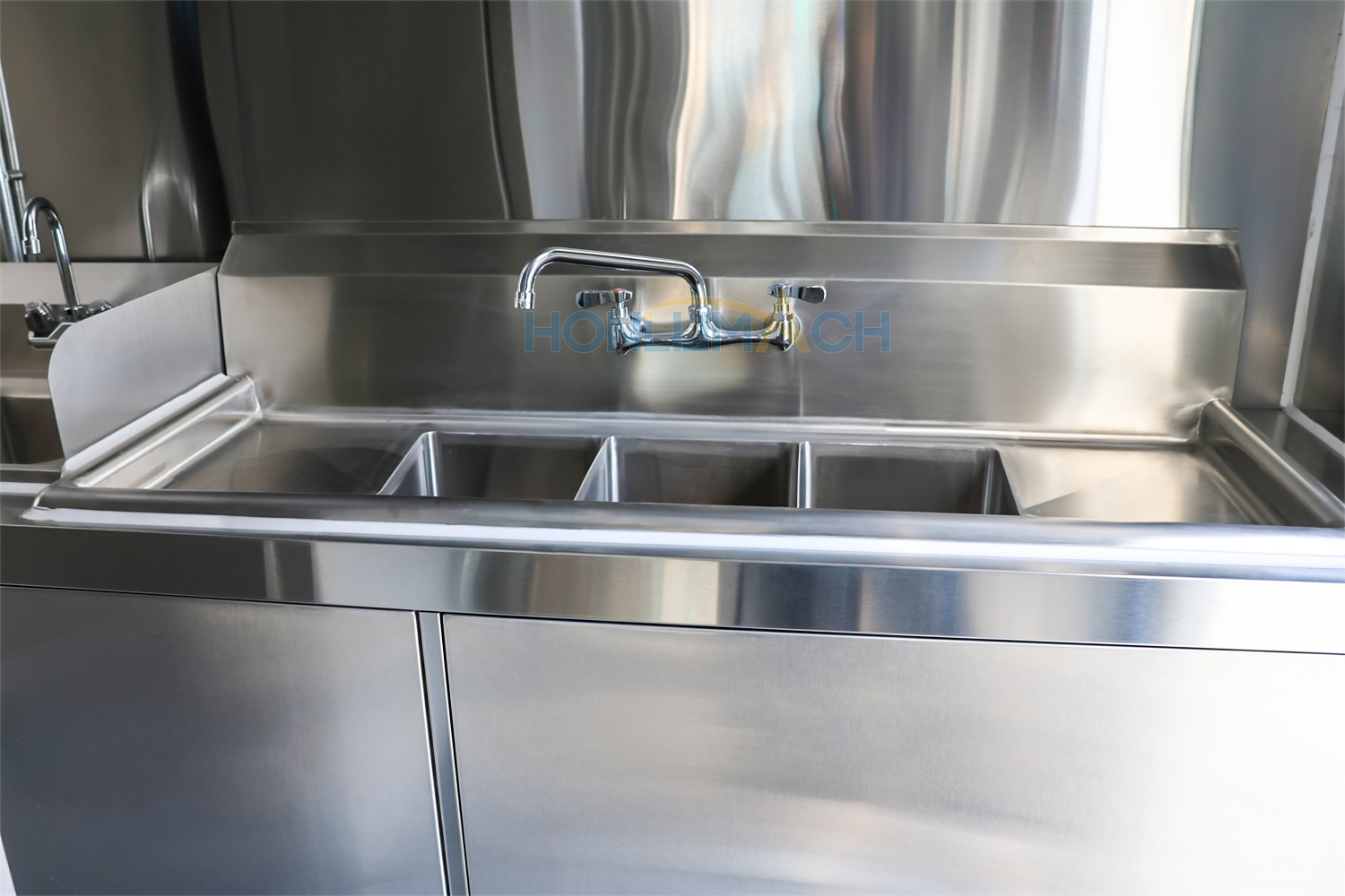 According to the customer’s requirements, we have equipped the 5.5m large catering trailer with kitchen equipment. In the following are some of the inner details of this trailer. There is a range hood, sinks, an air conditioner, a salad bar refrigerator, a gas stove, a gas fryer, a griddle, a grill, a storage cabinet, and a workbench, etc. Our customer will add some other equipment he needs after receiving the trailer.