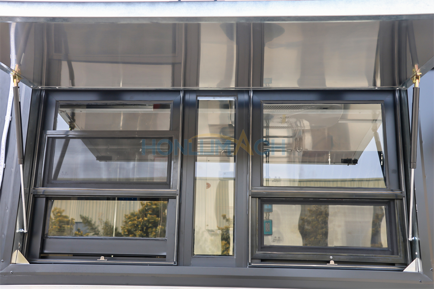 In the front of the food trailer, we have made two big servie windows according to the customer’s requirements. That will be very convenient for guests who come to dine to order and pick up their meals. On the top of each window, we have installed a retractable awning. The awning will protect people from sunshine and rain, which is a thoughtful design. Next, let’s see the back view of this large food trailer.