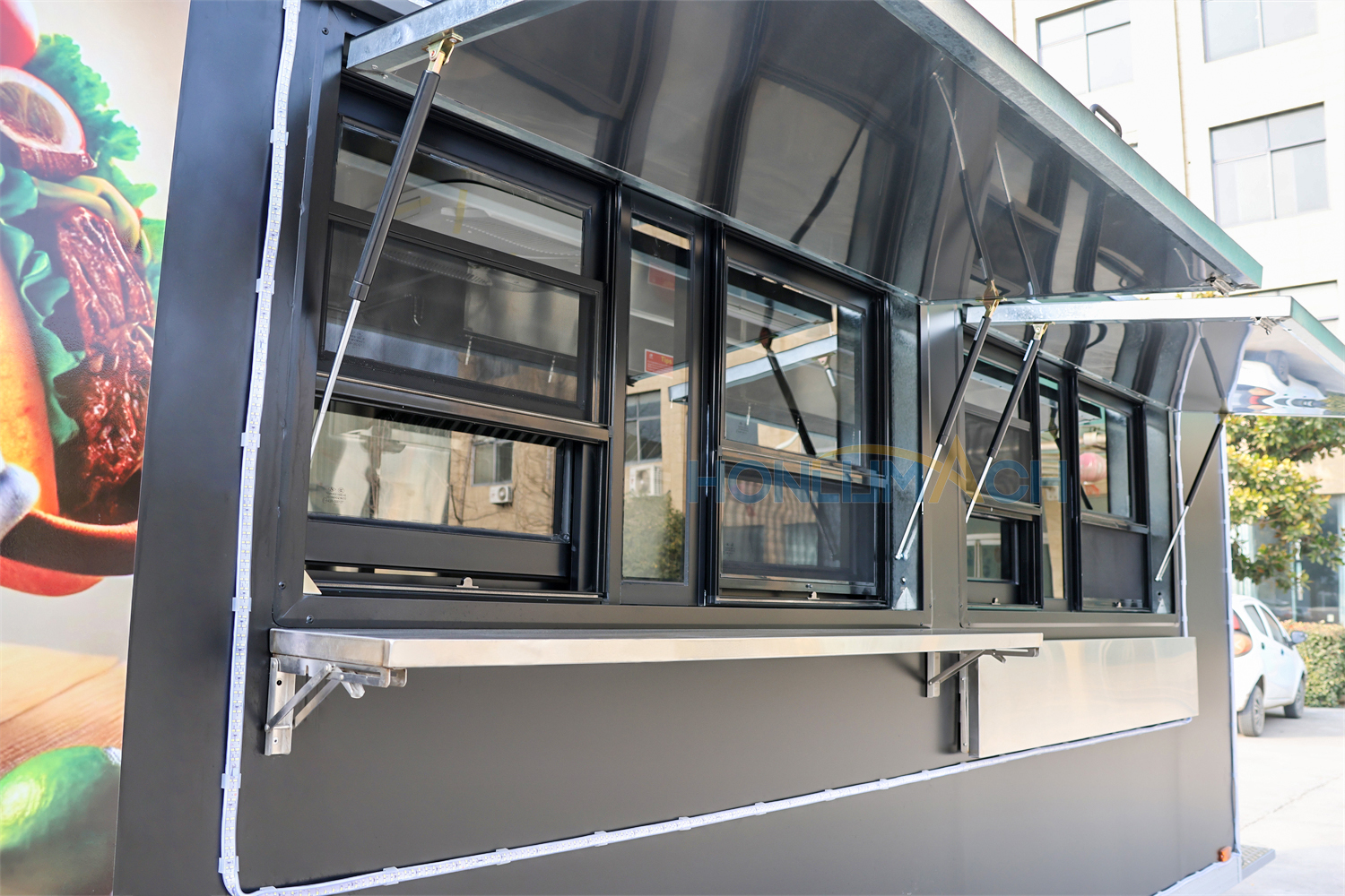 This is a food truck from Canada, approximately 18 feet long. The entire truck’s appearance, color, pattern, and structure were customized to the client’s specifications. It also features two custom-made windows with sunshades.