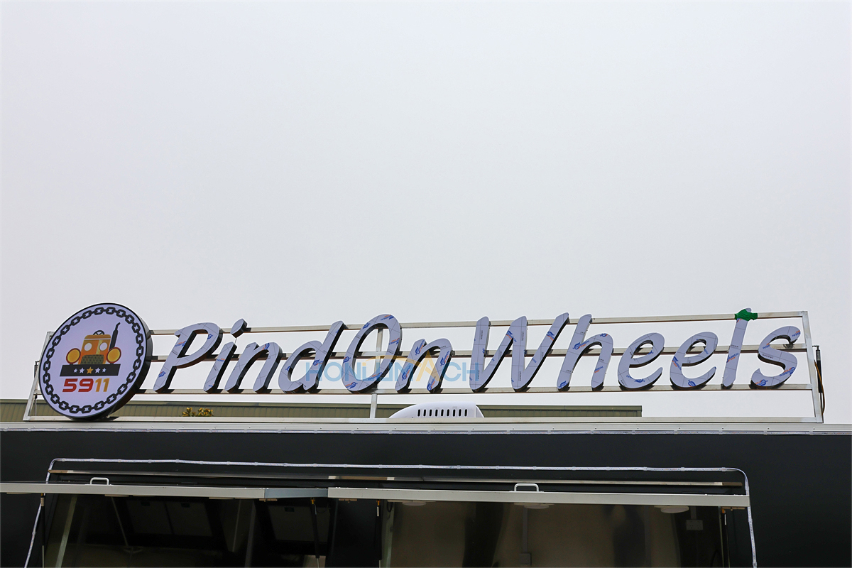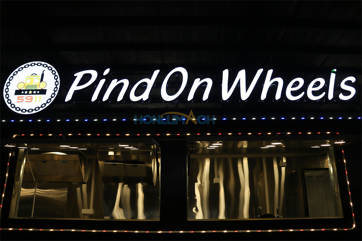 This is an 18-foot-long food truck, custom-made for our Norwegian clients. We tailored it to their specific requirements. As you can see in the pictures, it features a dazzling light bar that shines even in the dark, attracting attention, and is equipped with a custom-designed illuminated sign that glows even at night.