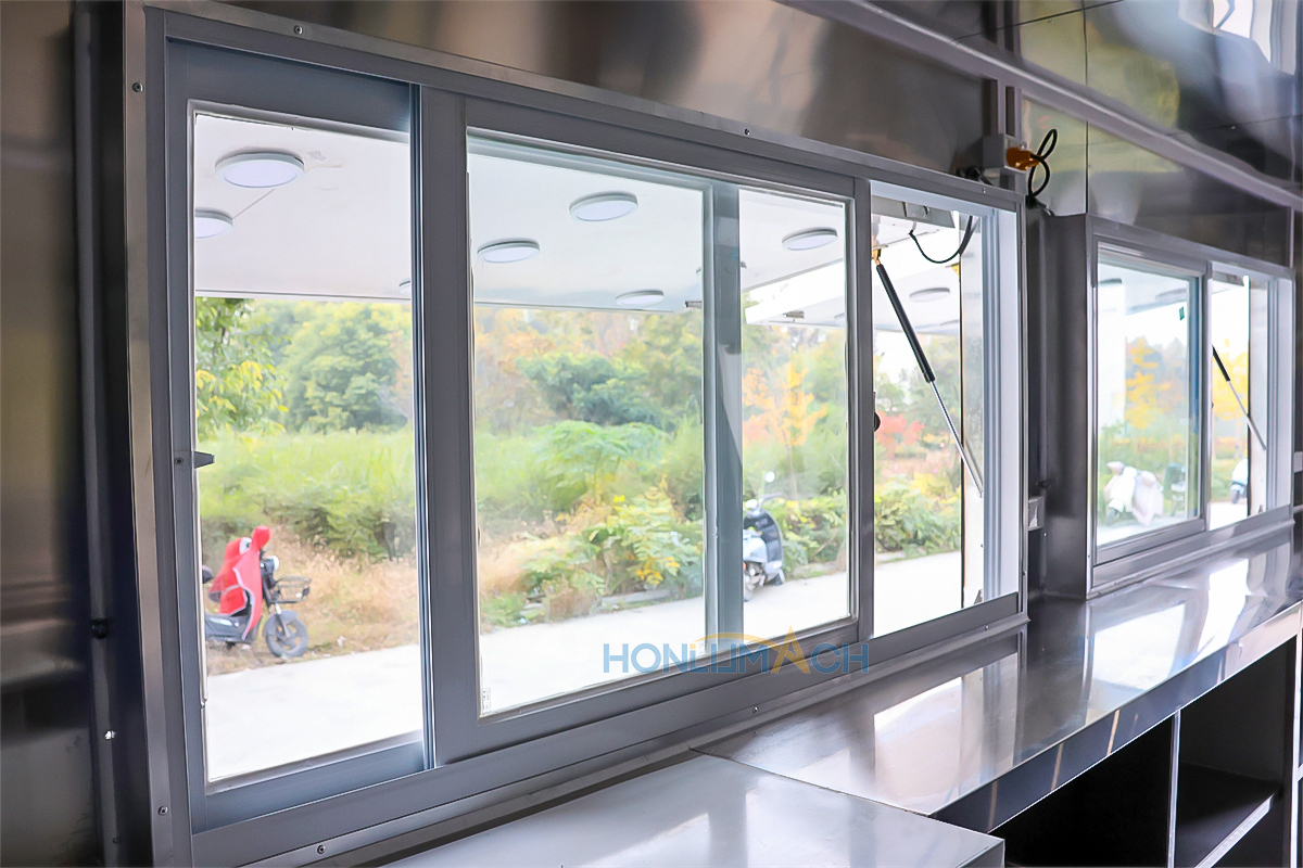 In the front of the food trailer, we have made two big servie windows according to the customer’s requirements. That will be very convenient for guests who come to dine to order and pick up their meals. On the top of each window, we have installed a retractable awning. The awning will protect people from the sunshine and rain, which is a thoughtful design. Next, let’s see the back view of this large food trailer.