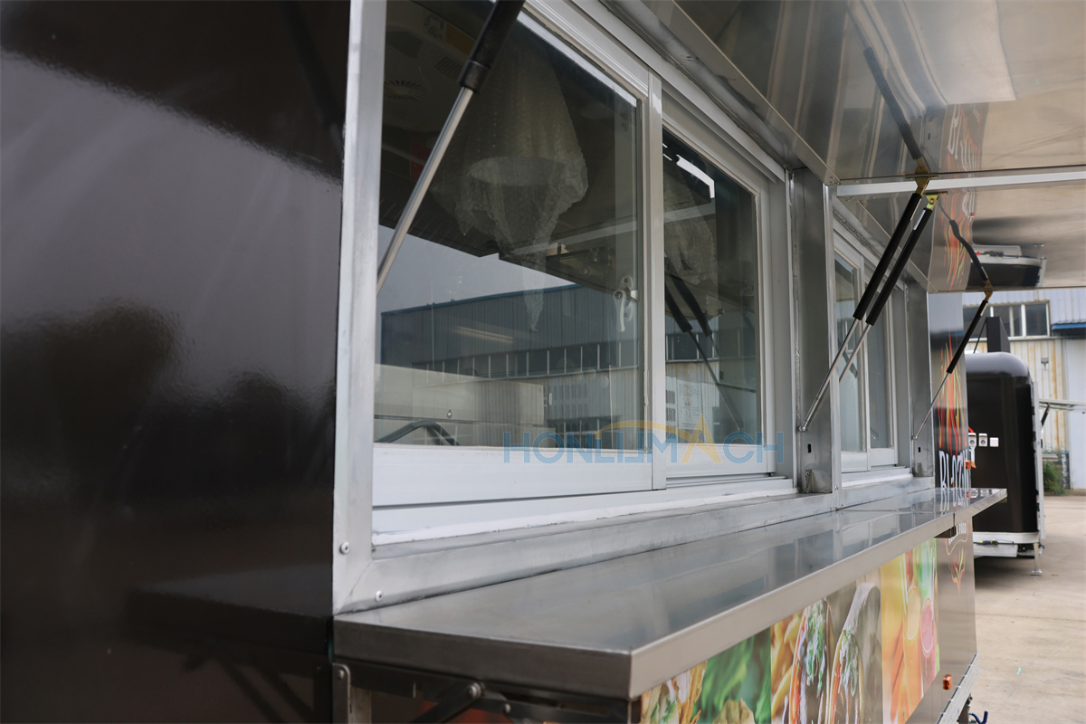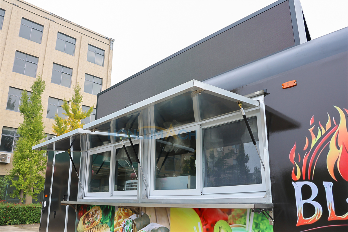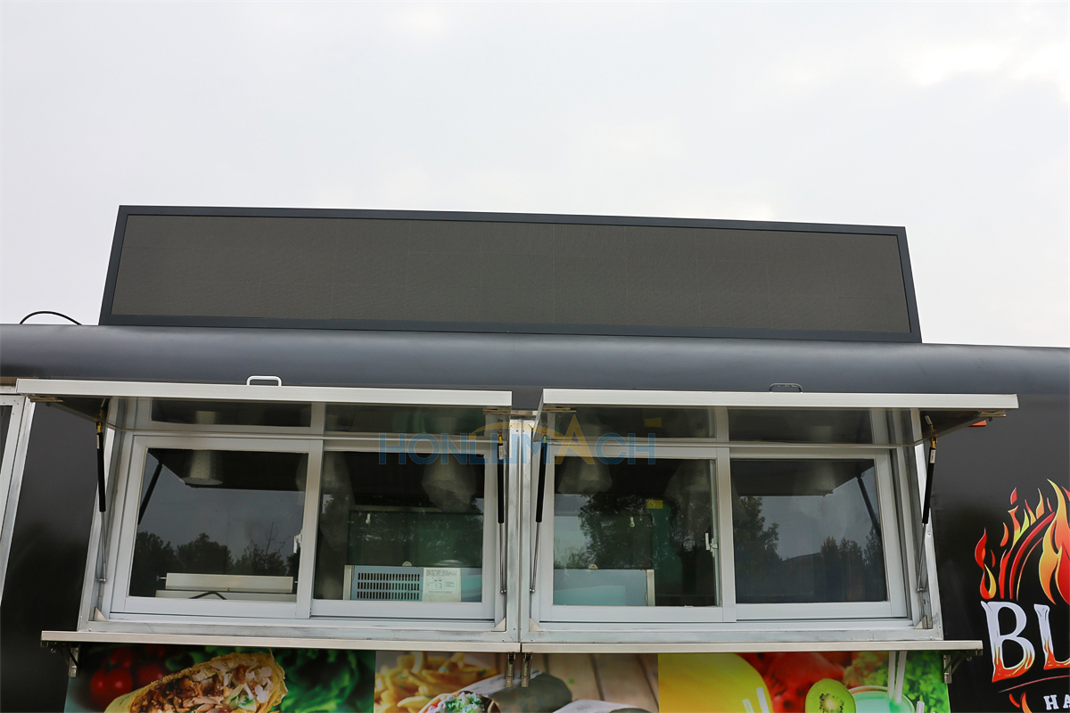 This is a 21 ft mobile food trailer we have customized for a customer from Greece. As we can see from the picture below, it has two big service windows in the front. Beside each window, there is a menu board. This food truck is customized to the customer’s requirements, featuring a large, intelligent light sign that can be easily changed even at night, and it shines brightly in the dark.