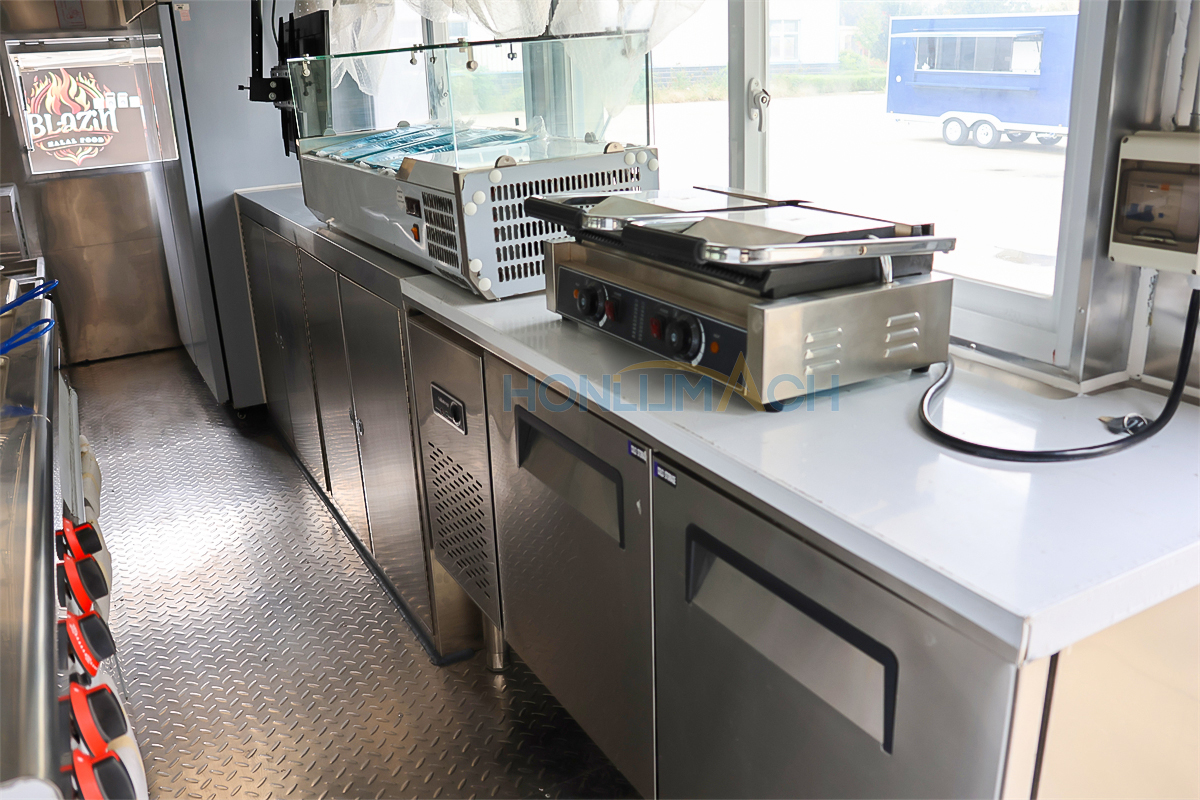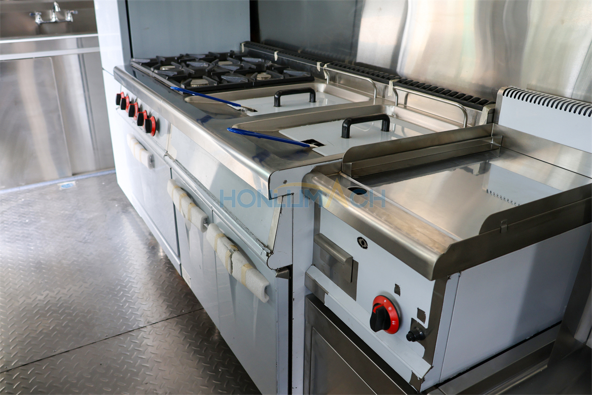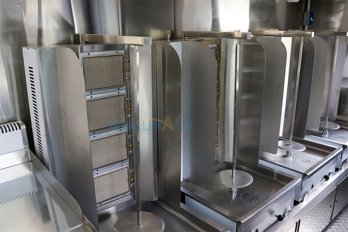 According to the customer’s requirements, we have equipped the 6.5m food truck with kitchen equipment. In the following are some of the inner details of this trailer. There is a range hood, an air conditioner, a gas griddle, a gas stove, a gas fryer, sinks, refrigerators, a shawarma machine, a dough mixer, a pancake machine, etc.