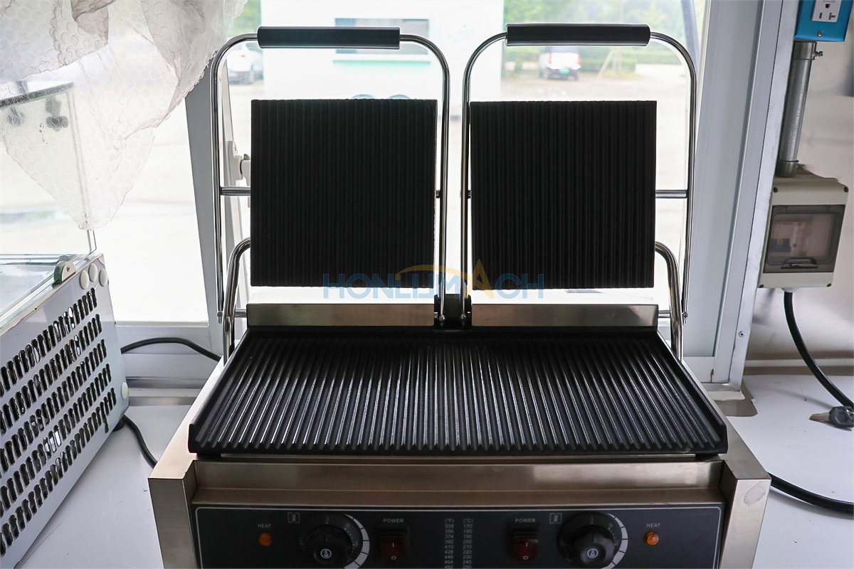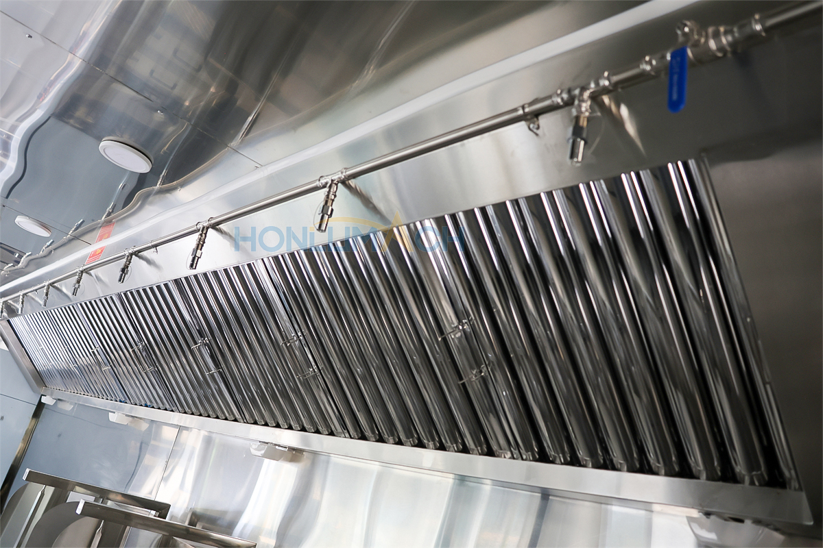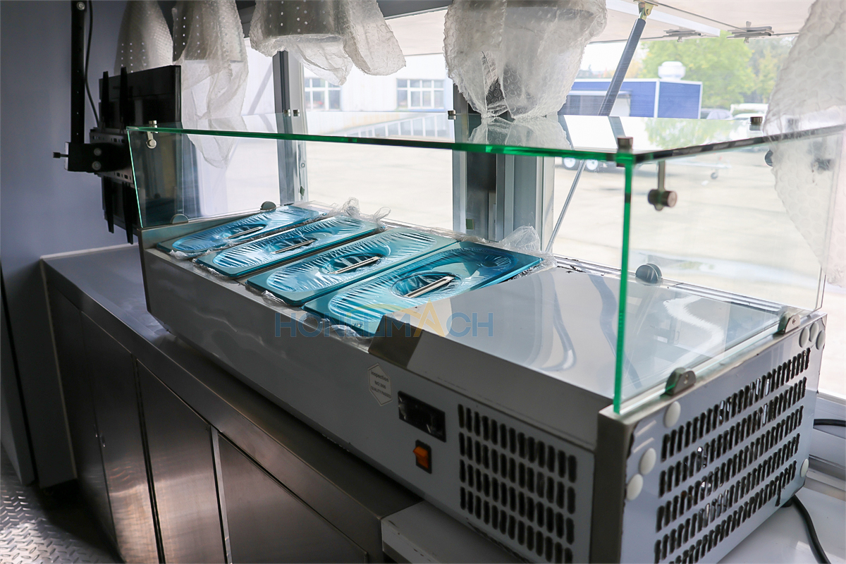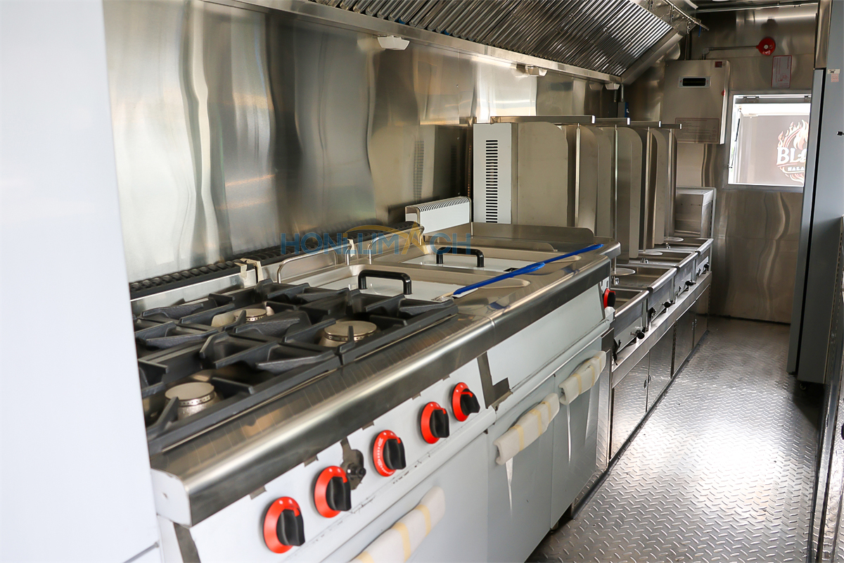 According to the customer’s requirements, we have equipped the 6.5m food truck with kitchen equipment. In the following are some of the inner details of this trailer. There is a range hood, an air conditioner, a gas griddle, a gas stove, a gas fryer, sinks, refrigerators, a shawarma machine, a dough mixer, a pancake machine, etc.