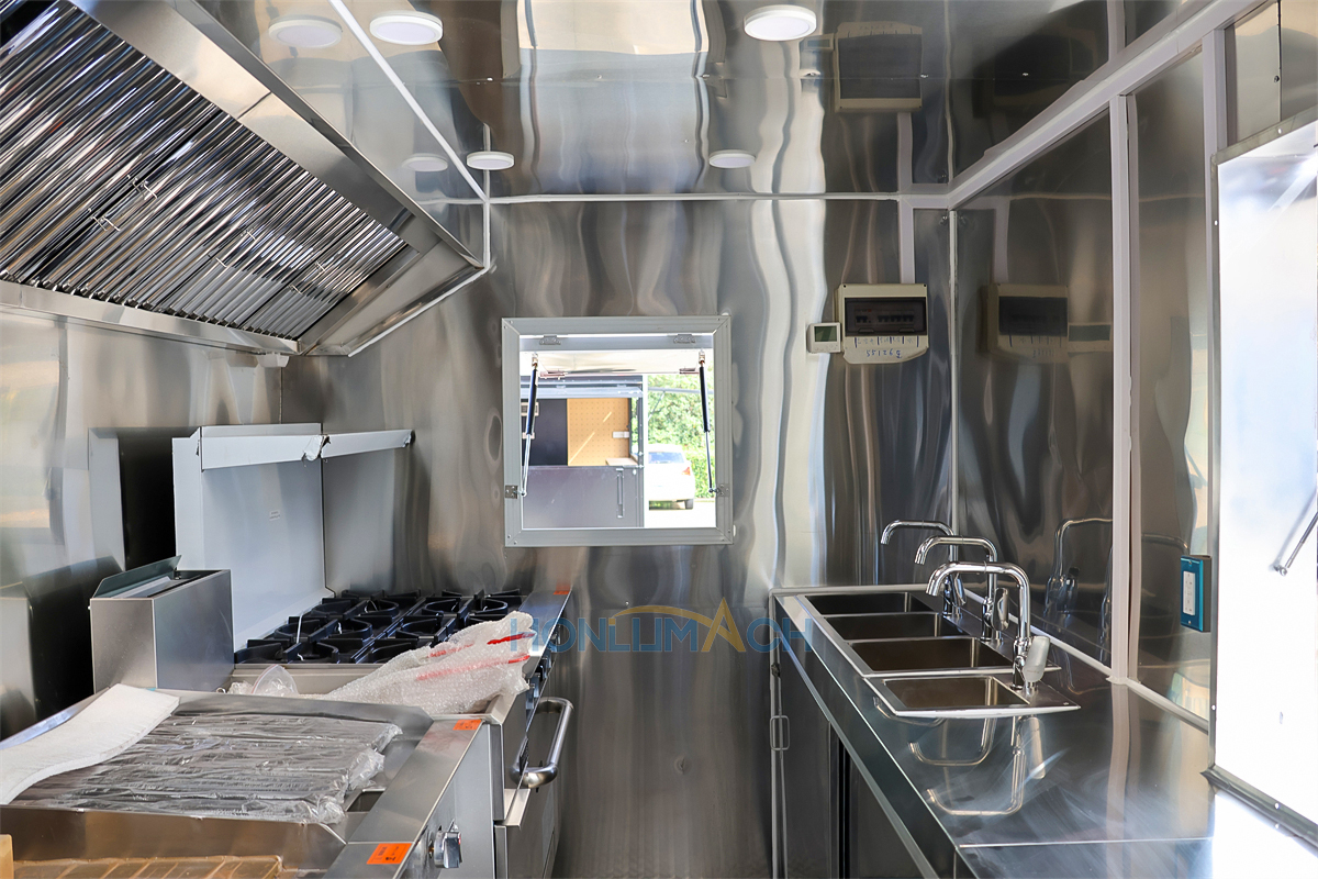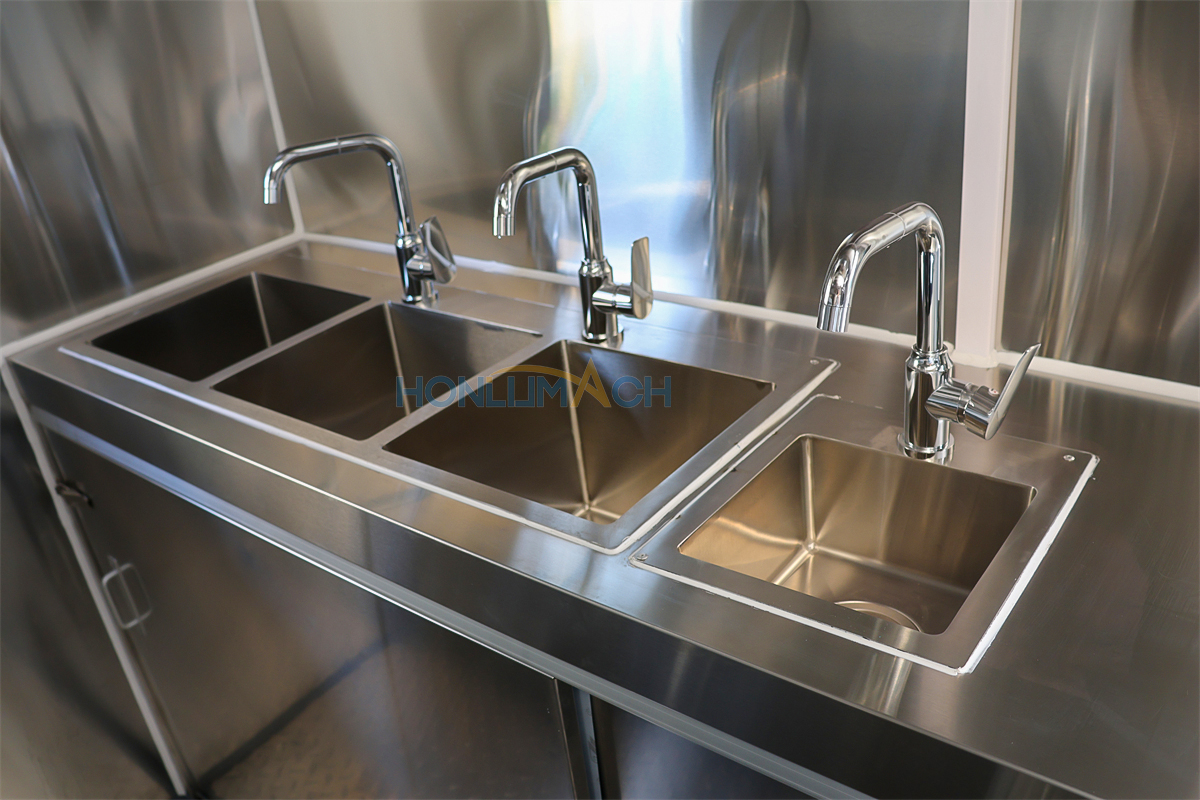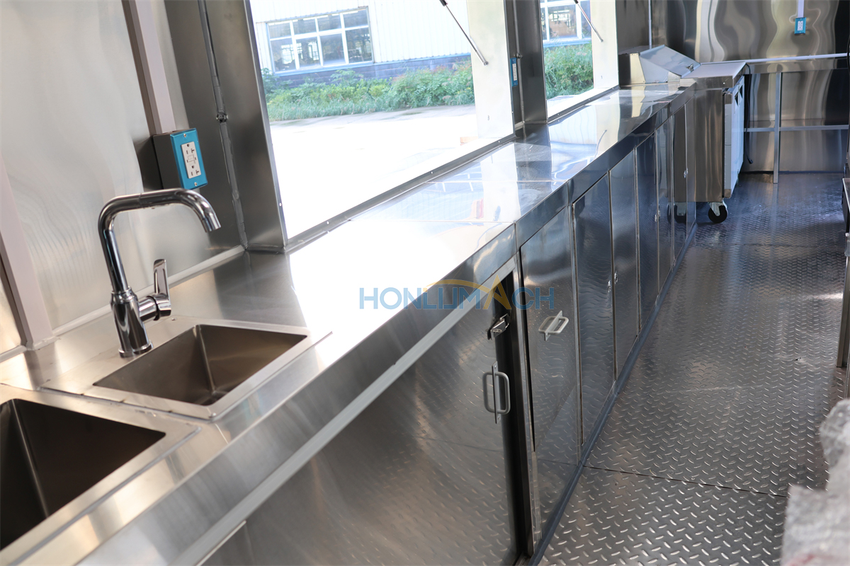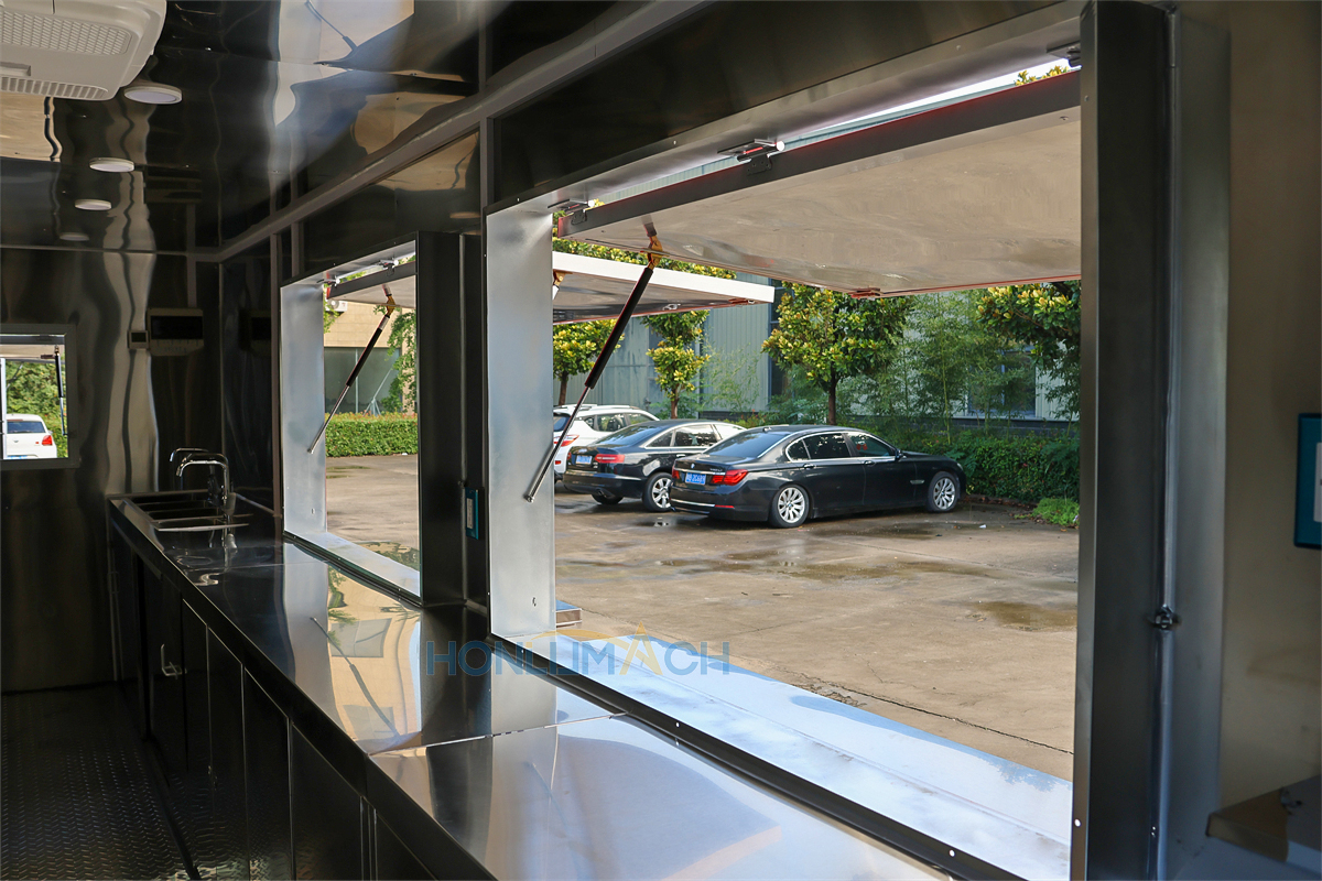| Standard Configuration | 1) 201 Stainless steel interior wall, 2) 201 stainless steel workbench, 3) 304 Stainless steel sinks *2 4) hot & cold tap *1 5) 20L water basket *2 6) tire*4 7) jack*4 8) big service window * 1 9) socket*6 10) power switch More, customized |