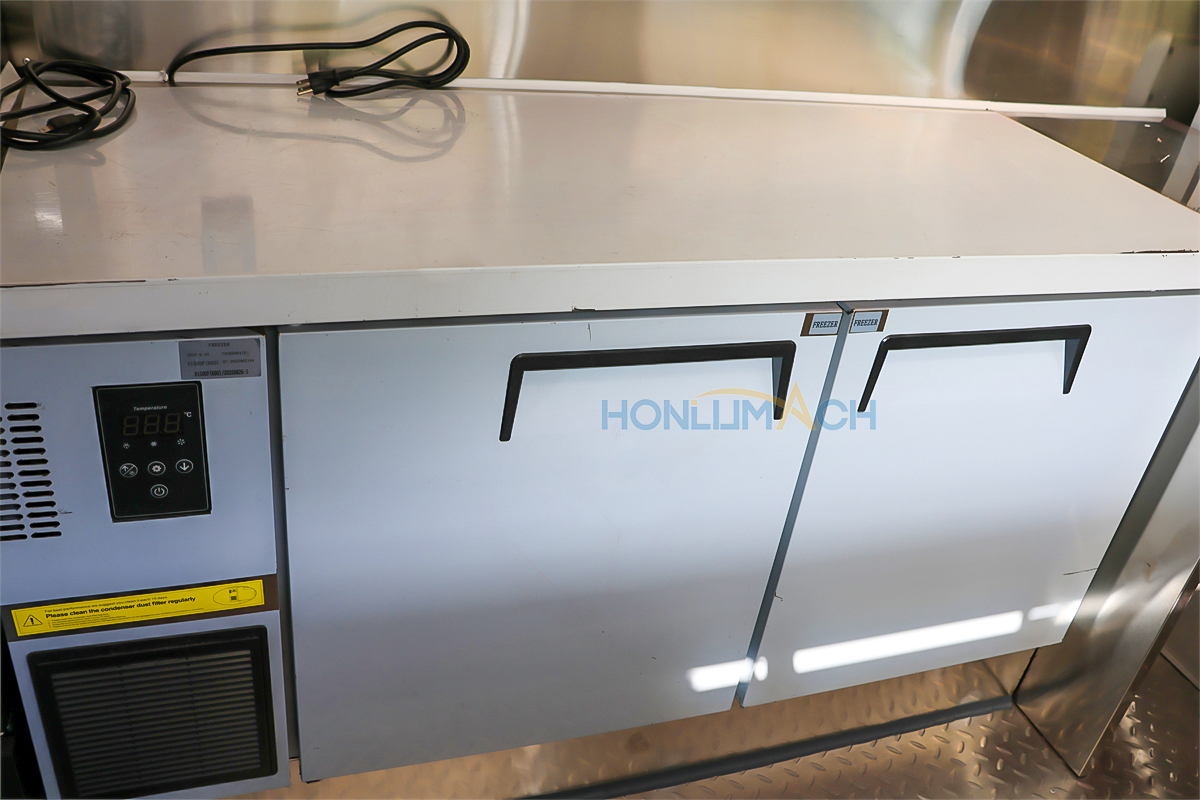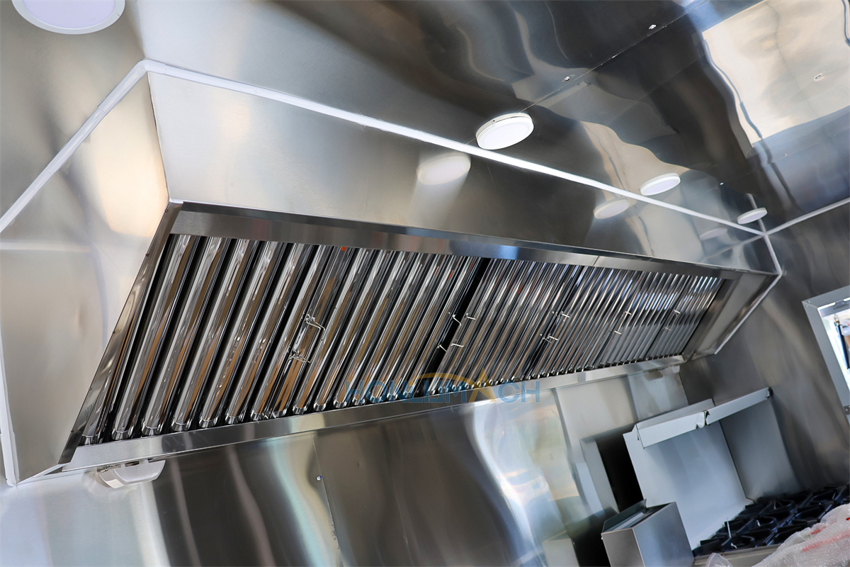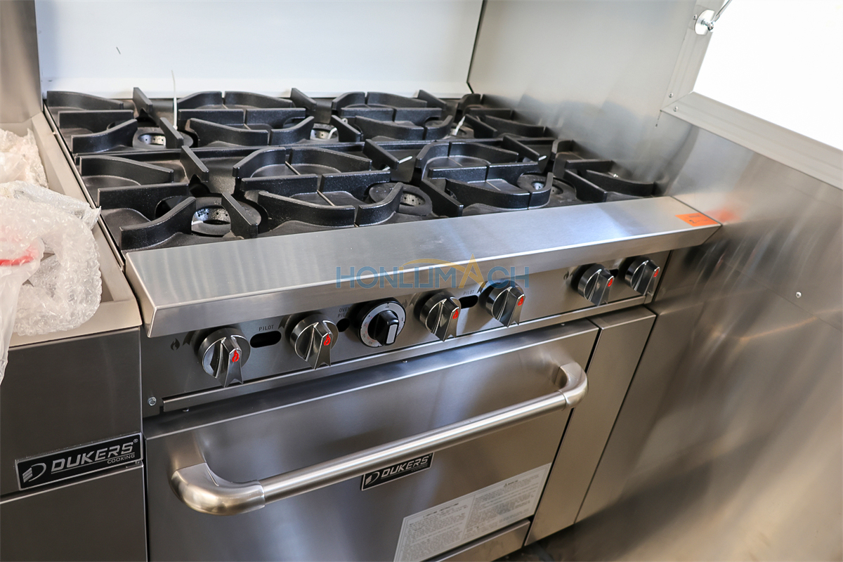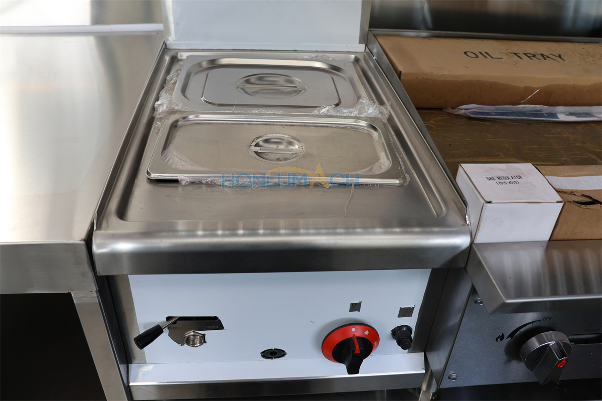 According to the customer’s requirements, we have equipped the 8m food truck with kitchen equipment. In the following are some of the inner details of this trailer. There are a range hood, an air conditioner, a gas griddle, a gas stove, a gas fryer, sinks, refrigerators, a shawarma machine, a dough mixer, a pancake machine, etc.