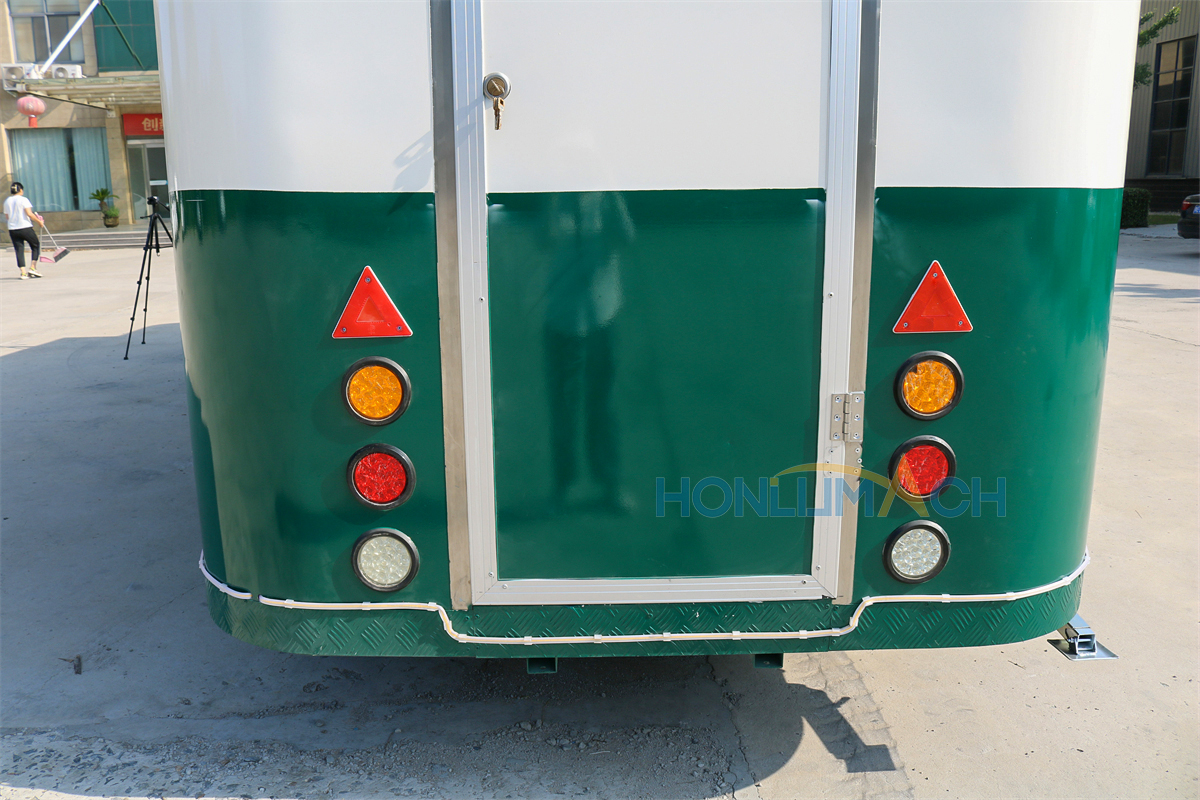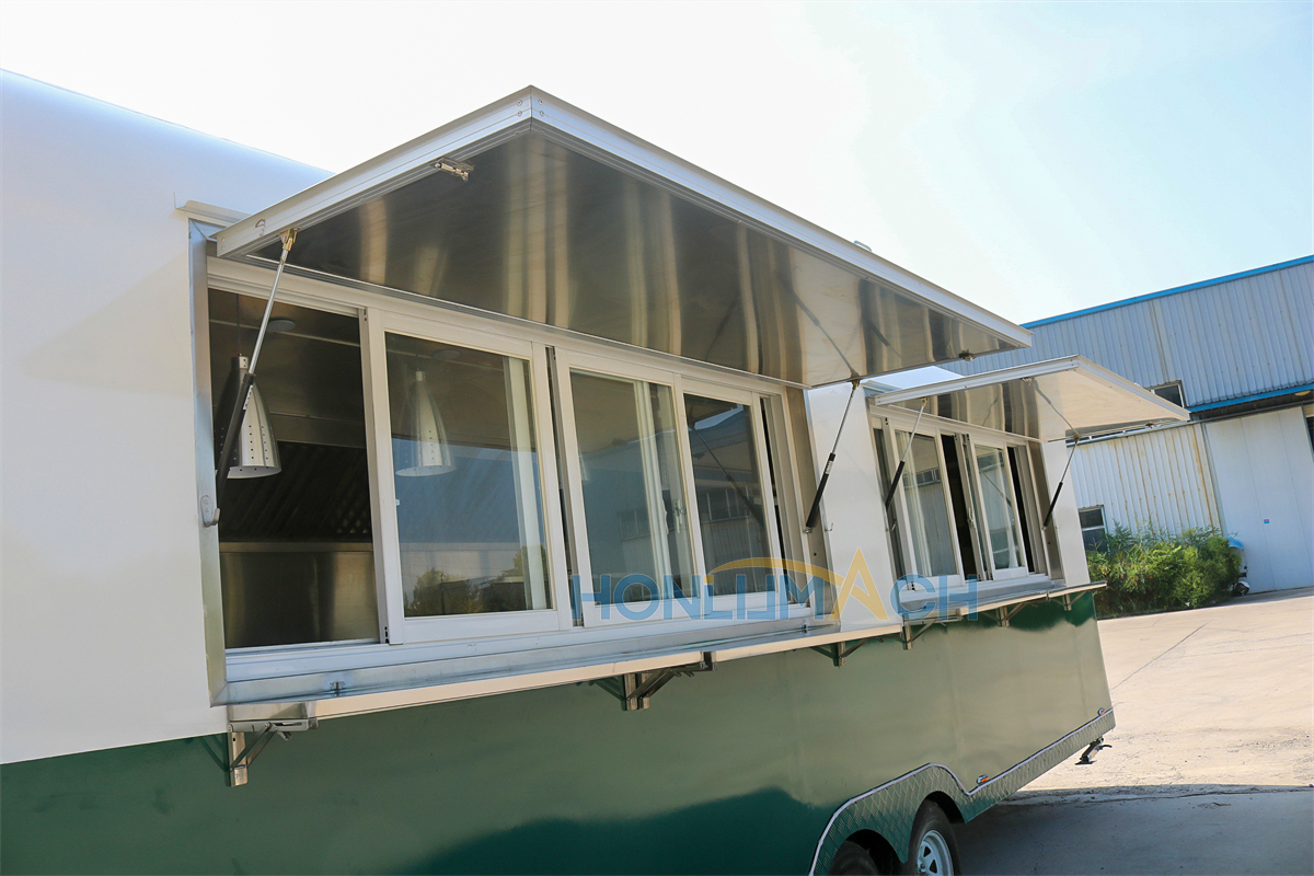 In front of the food trailer, we have made two big service windows according to the customer’s requirements. That will be very convenient for guests who come to dine to order and pick up their meals. On the top of each window, we have installed a retractable awning. The awning will protect people from sunshine and rain, which is a thoughtful design. Next, let’s see the back view of this large food trailer.