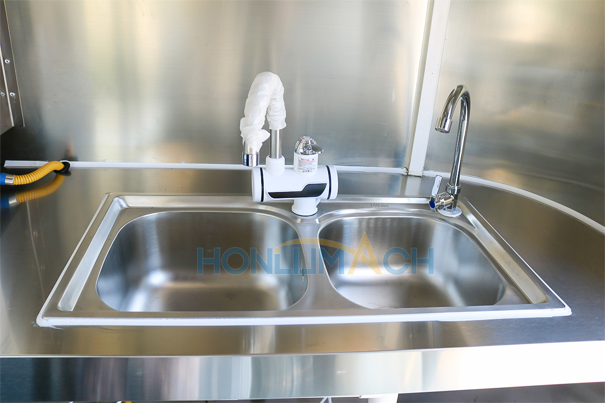 | Standard Configuration | 1) 201 Stainless steel interior wall, 2) 201 stainless steel workbench, 3) 304 Stainless steel sinks *2 4) hot & cold tap *1 5) 20L water basket *2 6) tire*4 7) jack*4 8) big service window * 1 9) socket*6 10) power switch More, customized |