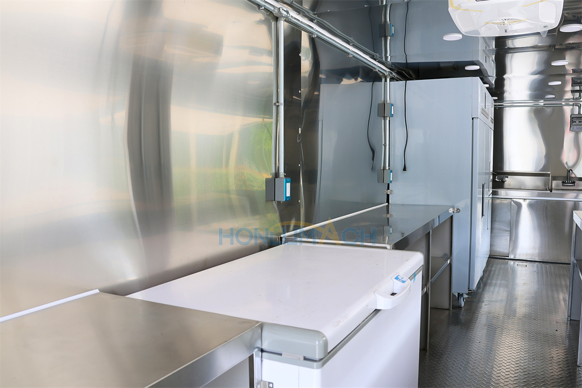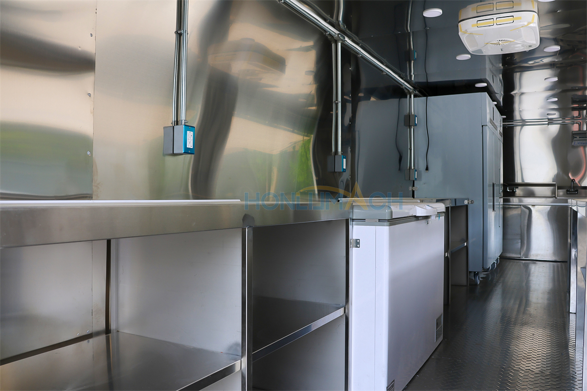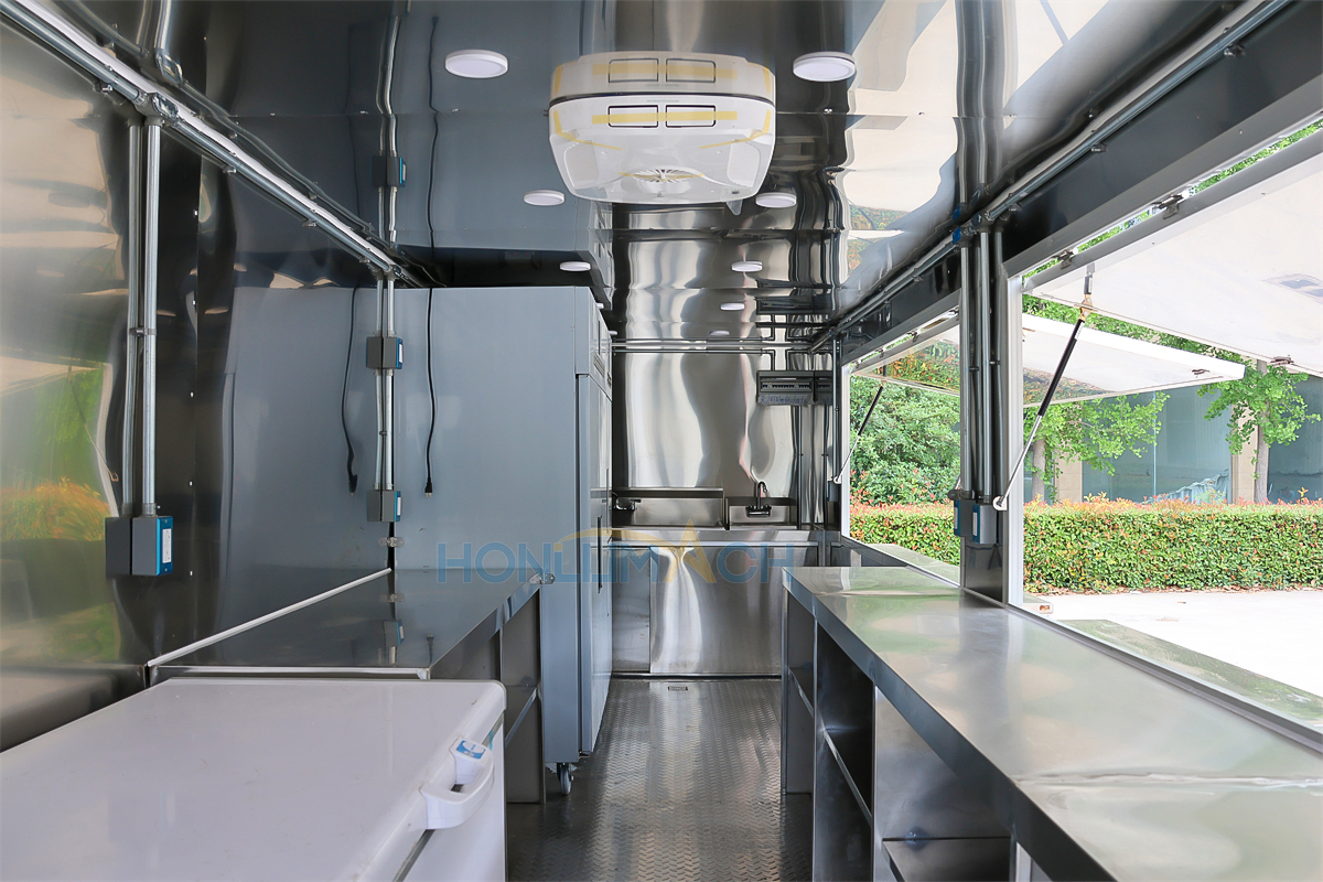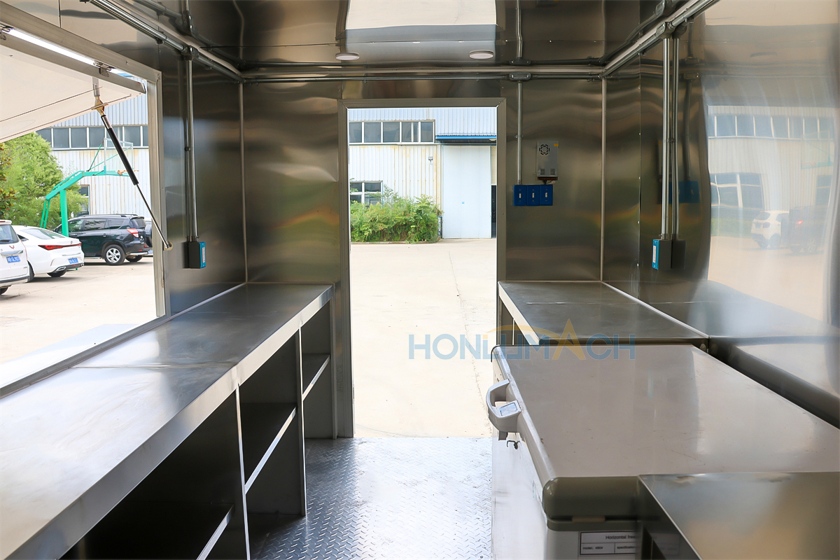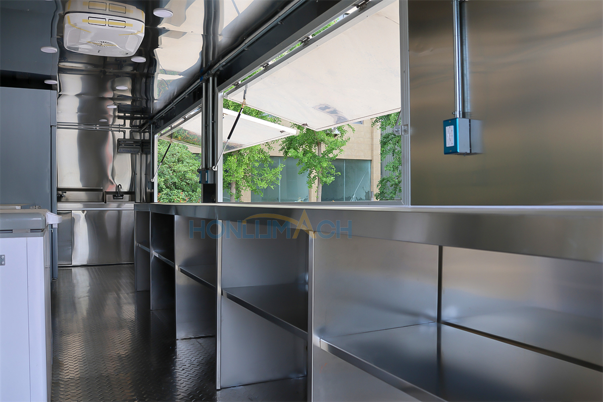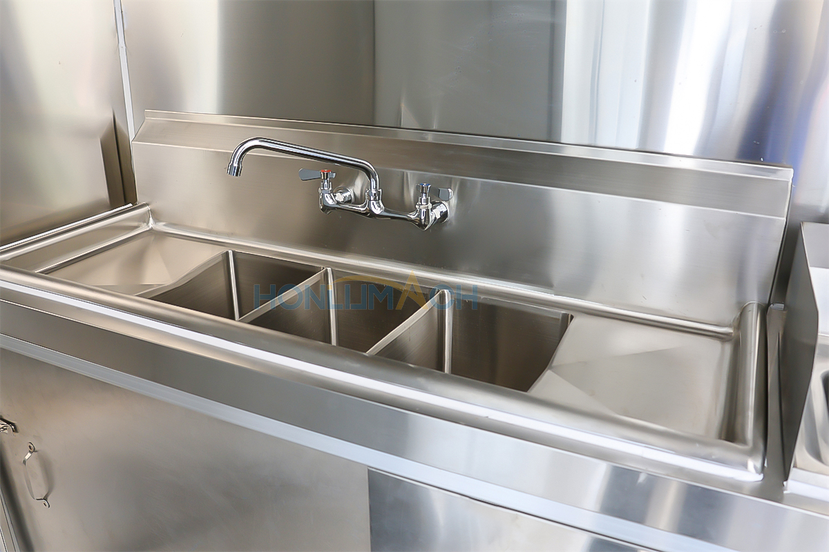 | Standard Configuration | 1) 201 Stainless steel interior wall, 2) 201 stainless steel workbench, 3) 304 Stainless steel sinks *2 4) hot & cold tap *1 5) 20L water basket *2 6) tire*4 7) jack*4 8) big service window * 1 9) socket*6 10) power switch More, customized |