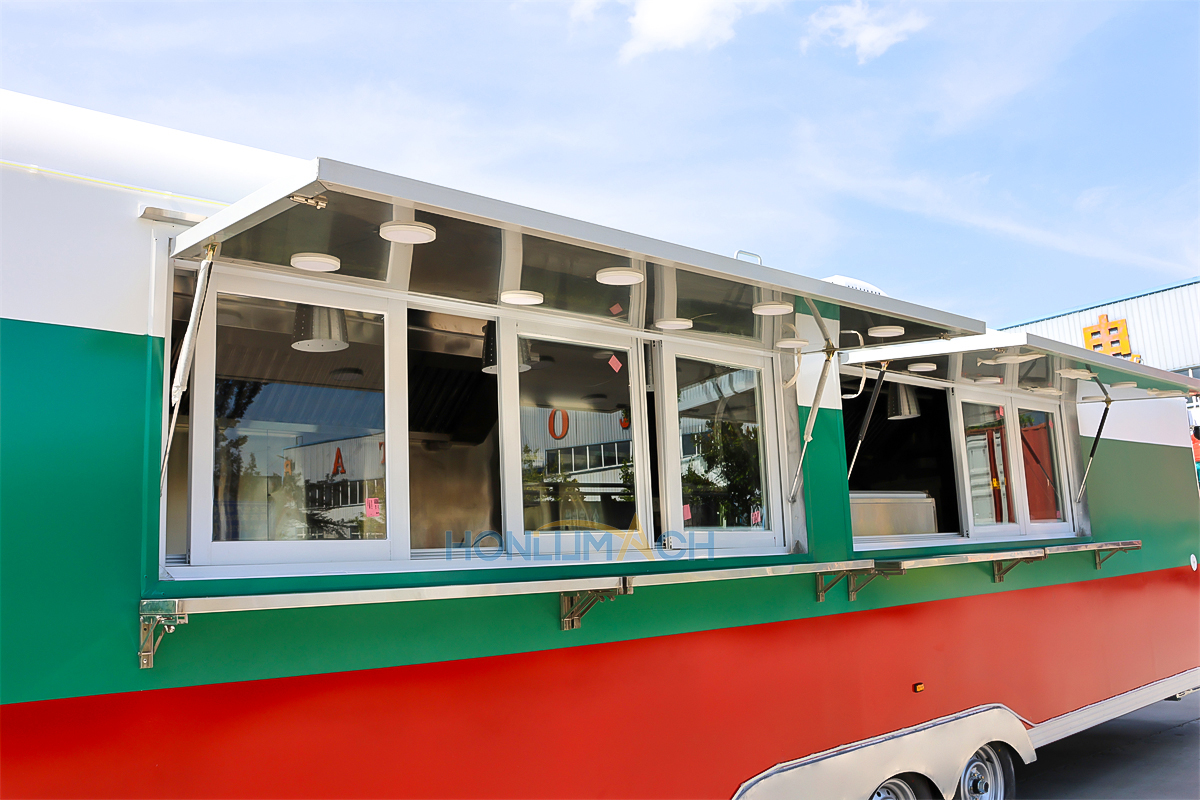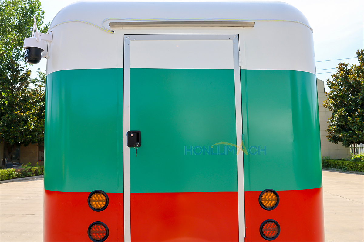 In the front of the food trailer, we have made two big servie windows according to the customer’s requirements. That will be very convenient for guests who come to dine to order and pick up their meals. On the top of each window, we have installed a retractable awning. The awning will protect people from sunshine and rain, which is a thoughtful design. Next, let’s see the back view of this large food trailer.