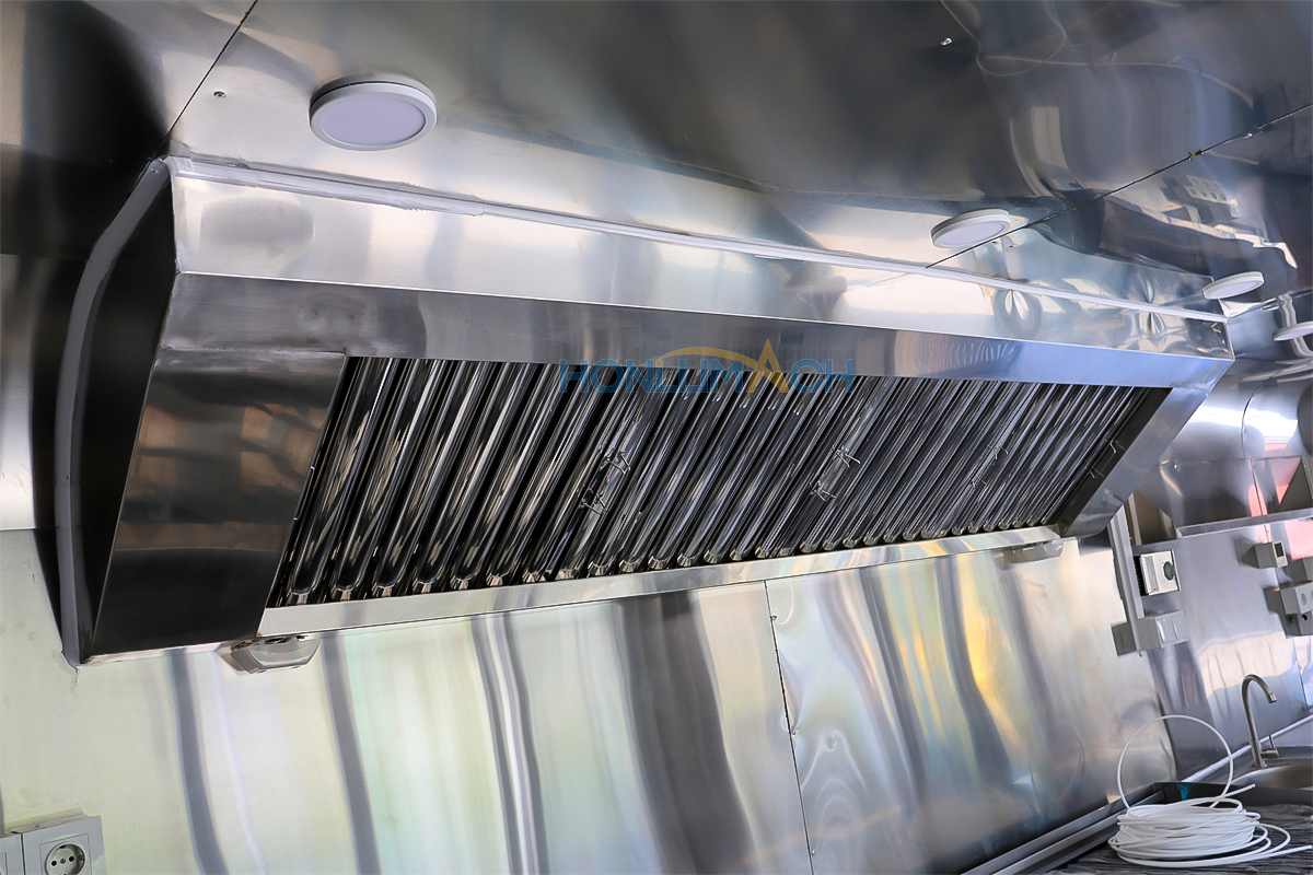 According to the customer’s requirements, we have equipped the 9m large catering trailer with kitchen equipment. In the following are some of the inner details of this trailer. There is a range hood, sinks, an air conditioner, a salad bar refrigerator, a gas stove, a gas fryer, a griddle, a grill, a storage cabinet, and a workbench, etc. Our customer will add some other equipment he needs after receiving the trailer.